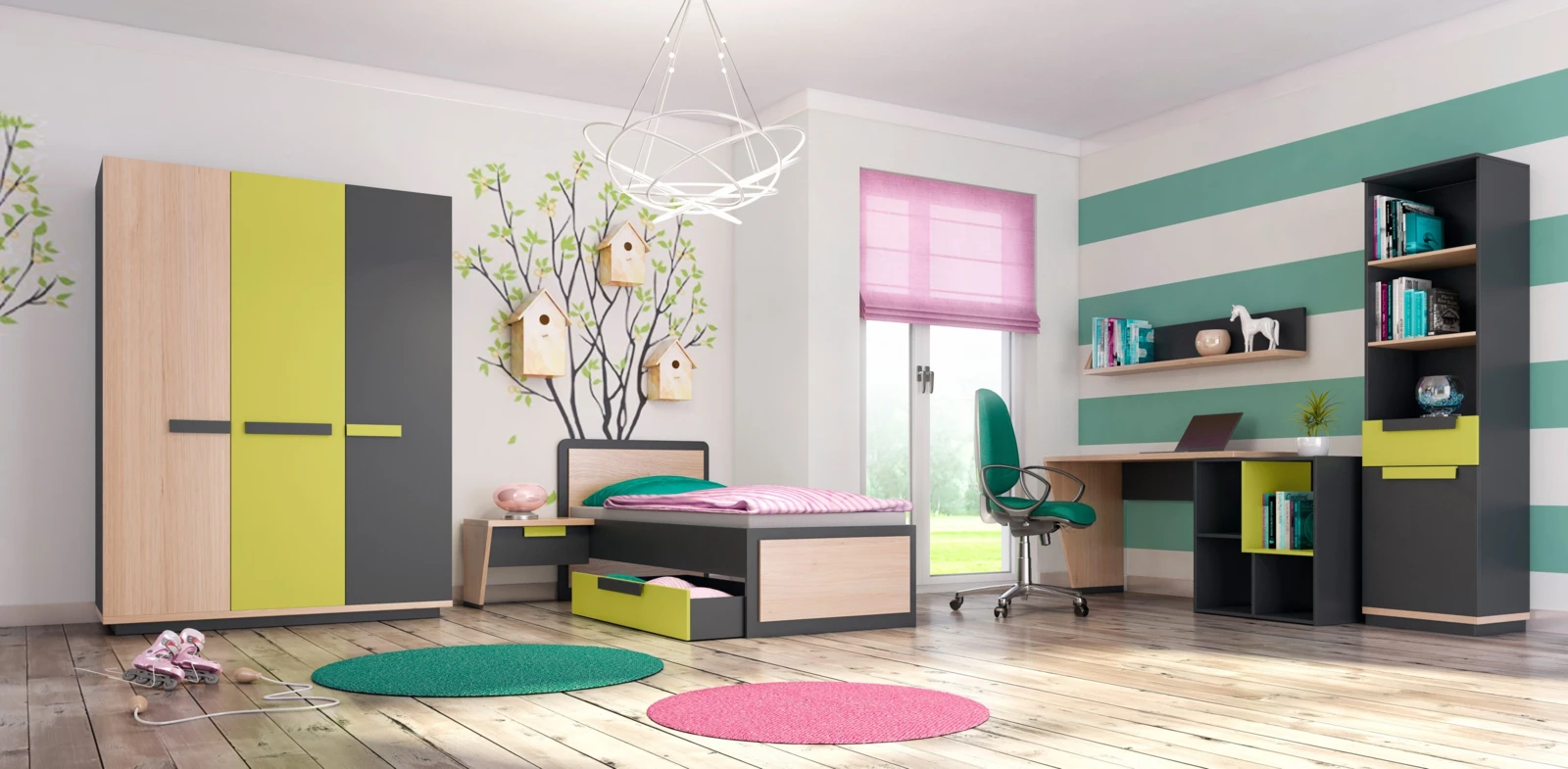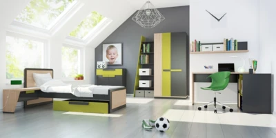Barevné provedení je grafit / dub Nagano / zelená iguana.