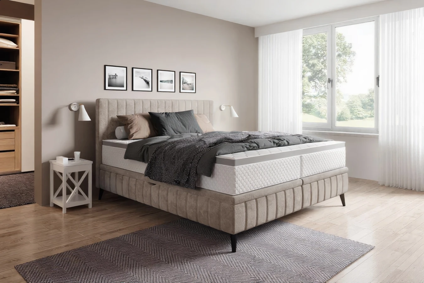 Luxusní čalouněná postel s úložným prostorem a se stylovým prošíváním čela a boků.