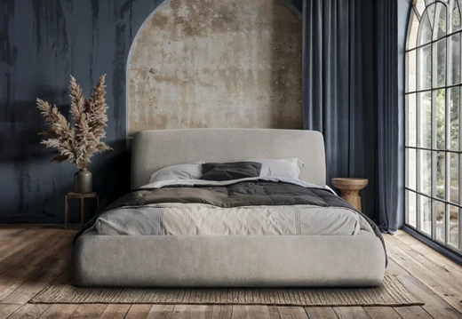 Velké měkké čelo postele s jemně zaoblenými hranami působí velmi útulně a hřejivě.