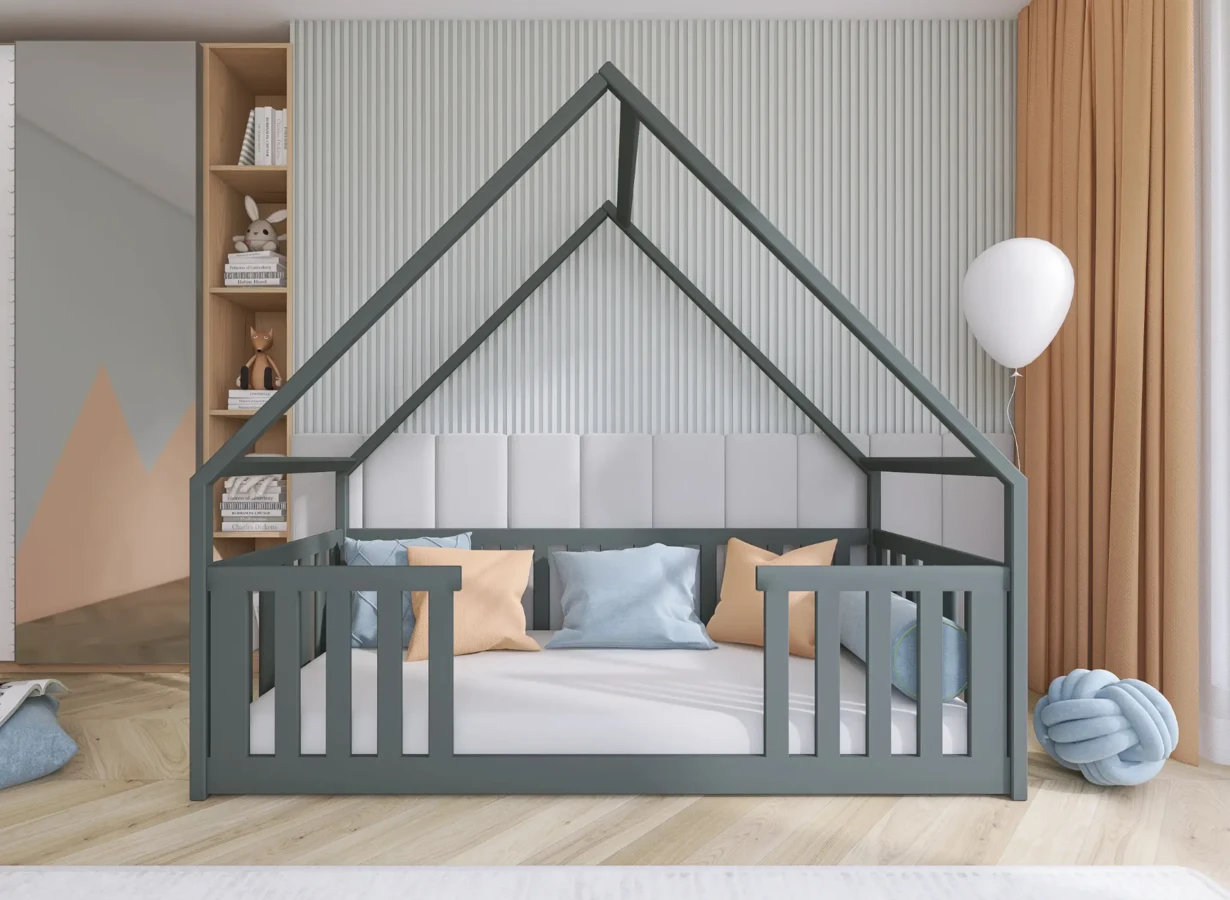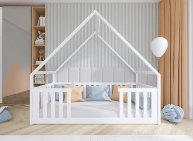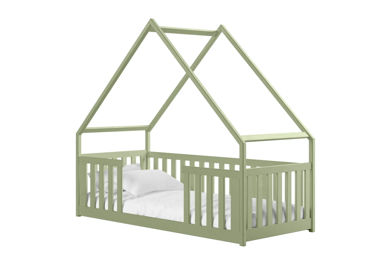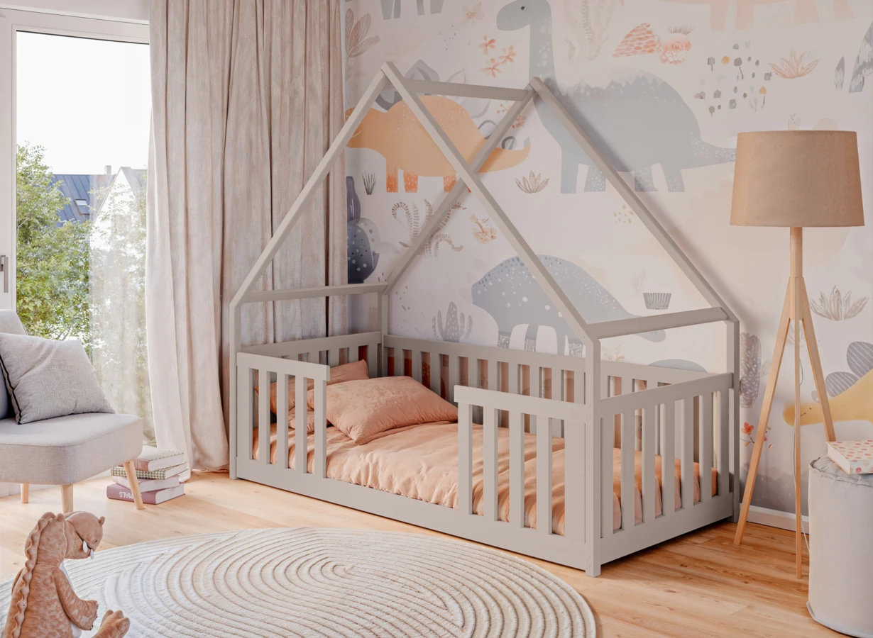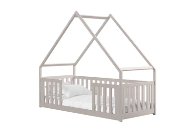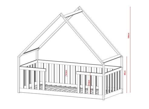Dětská postel ve tvaru domečku z masivní borovice je navržena tak, aby kombinovala bezpečný spánek s hravým designem.