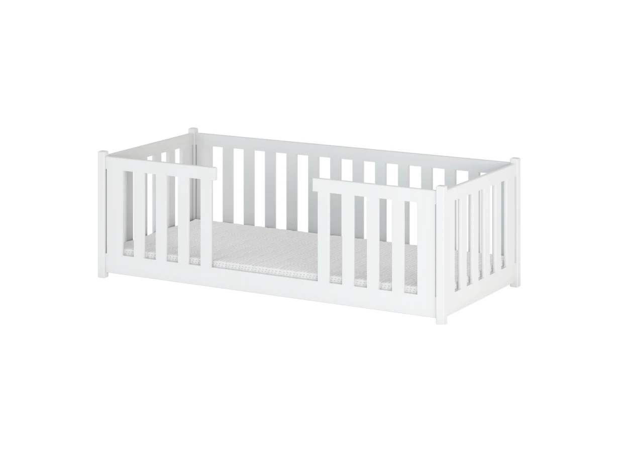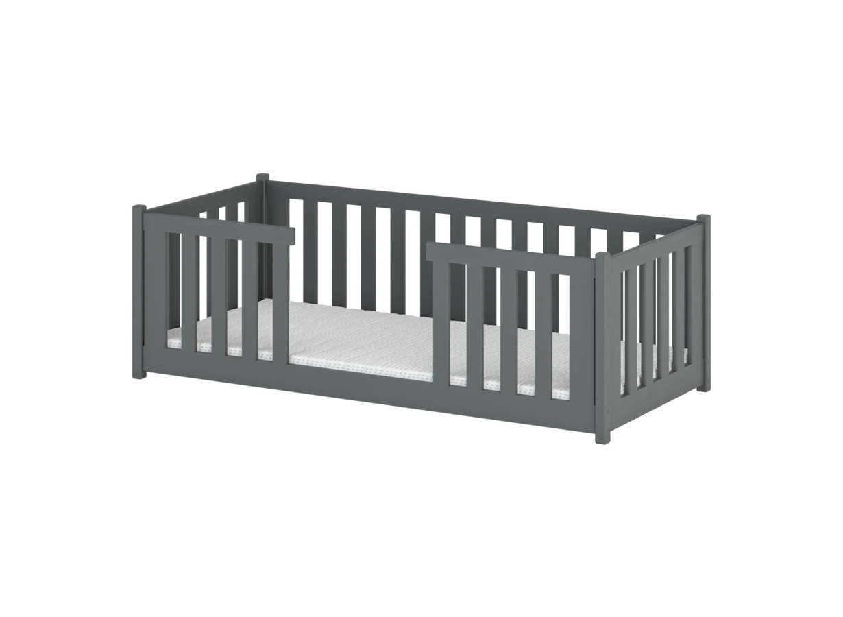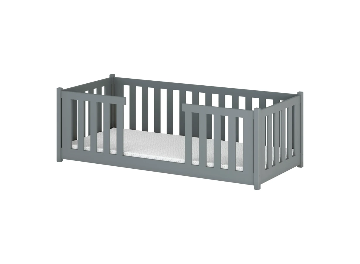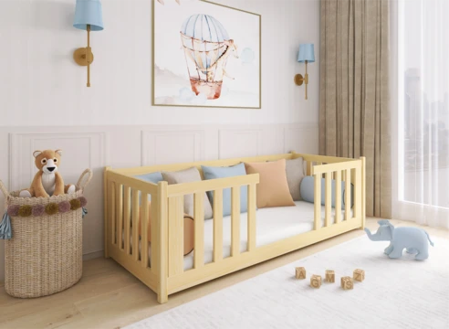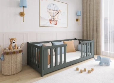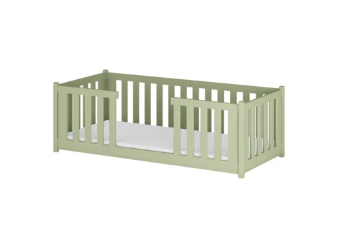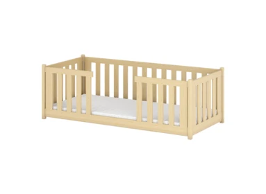 Moderní dětská jednolůžková postel, která je určena jako nízké samostatné lůžko s bezpečnostními prvky.