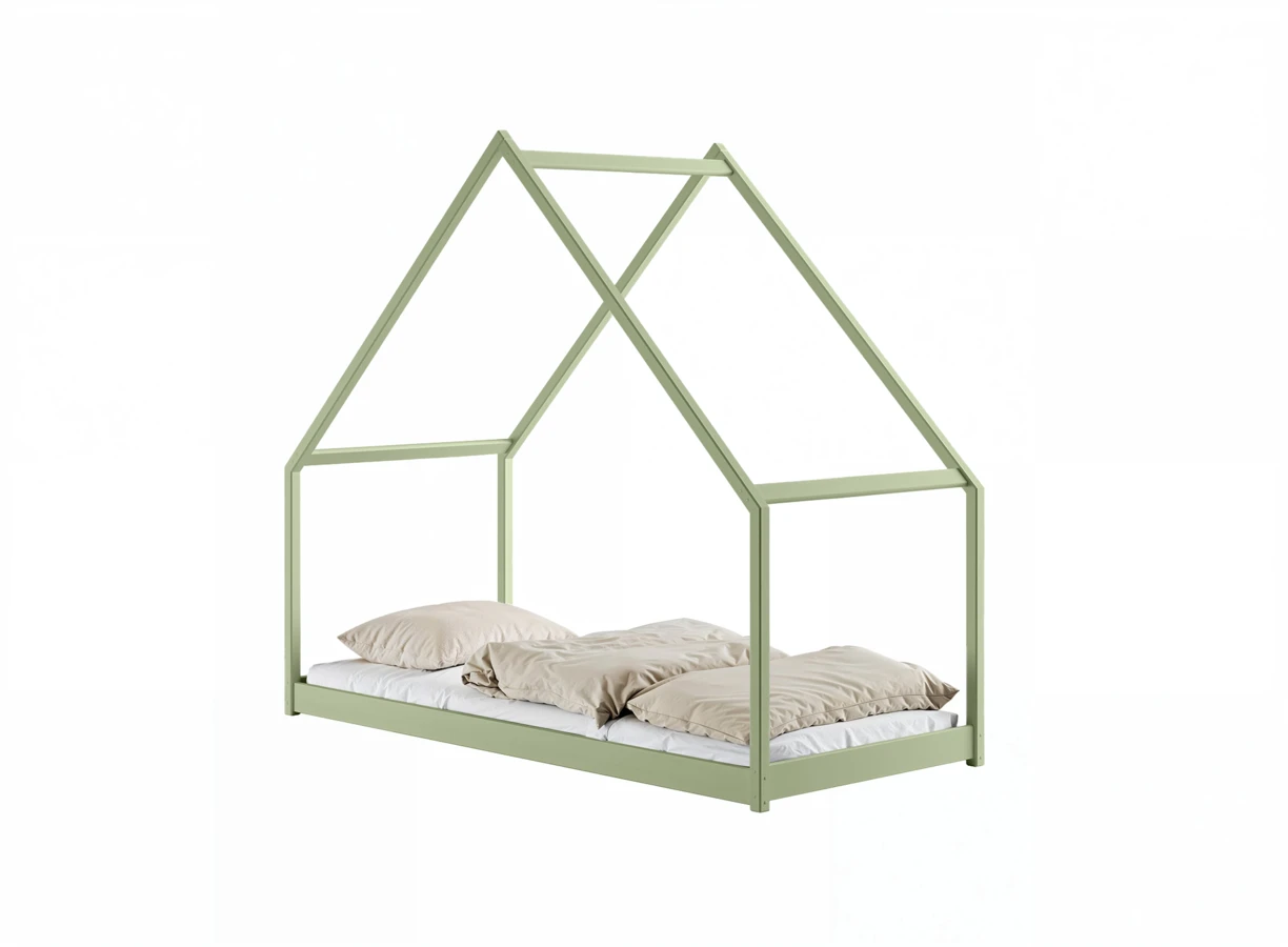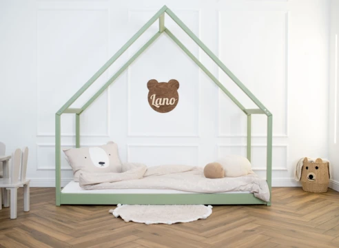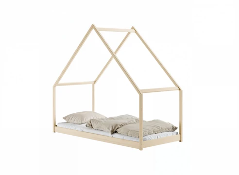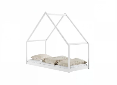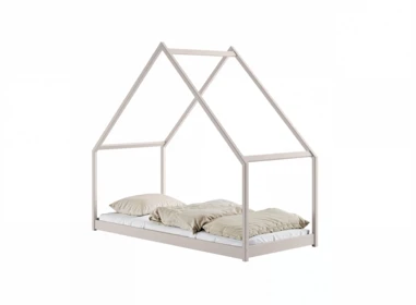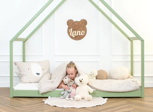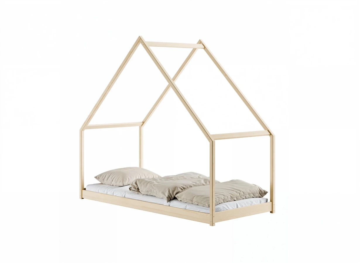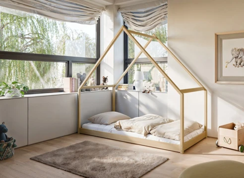 Dětská postel ve tvaru domečku z masivní borovice nabízí kombinaci útulnosti a praktičnosti s hravým designem.