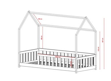 Dětská postel ve tvaru domečku z masivní borovice je navržena tak, aby kombinovala bezpečný spánek s hravým designem.