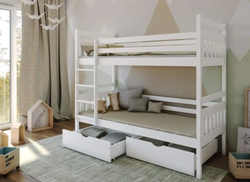 Dvoupatrová postel s úložným prostorem nabízí dvě pohodlná lůžka v kompaktním uspořádání, ideální pro sourozence.