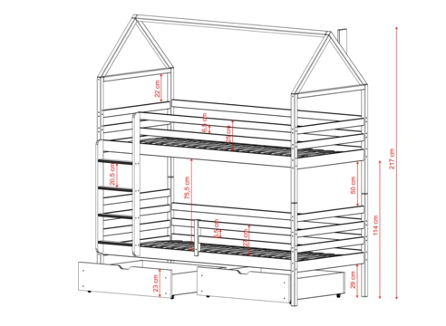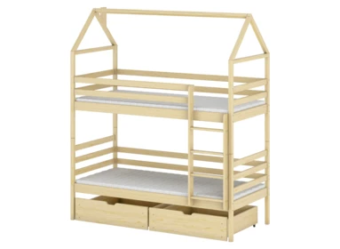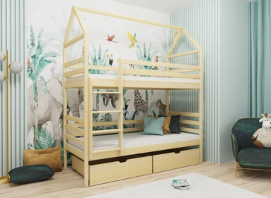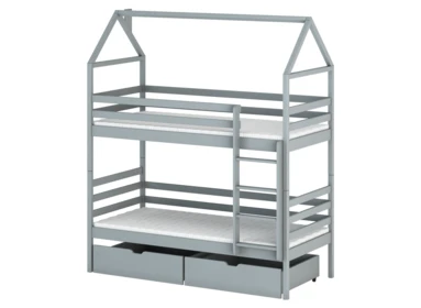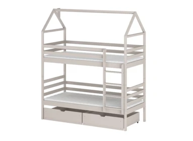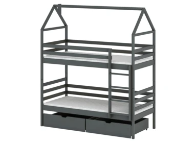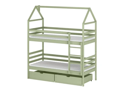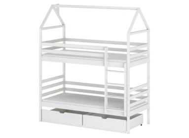 Dvoupatrová postel ve tvaru domečku nabízí dvě pohodlná lůžka v kompaktním uspořádání, ideální pro sourozence.