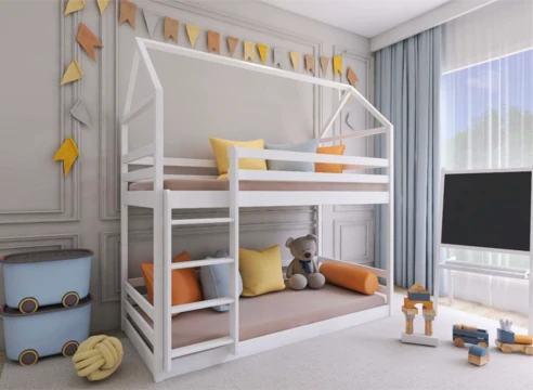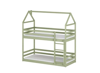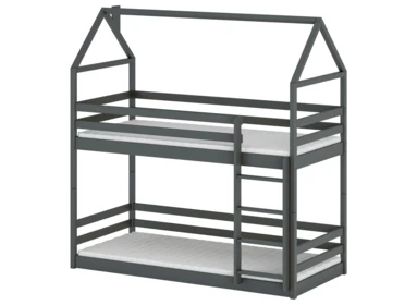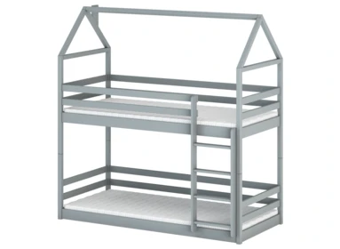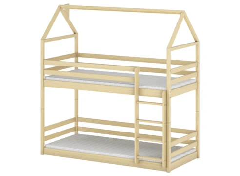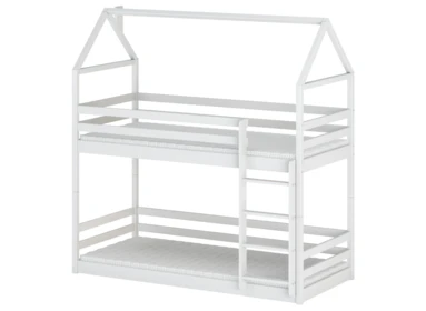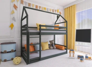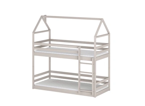 Dětská dvoupatrová postel ve tvaru domečku nabízí dvě pohodlná lůžka v jednom a šetří místo v pokoji.