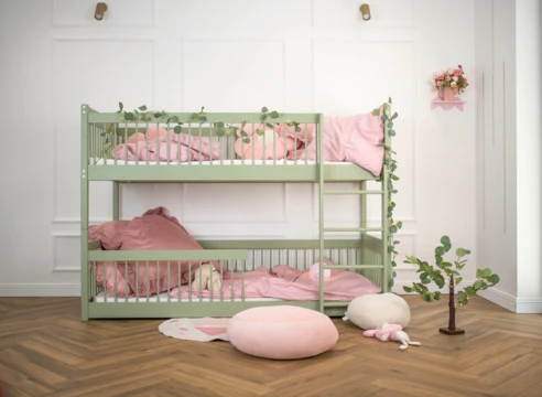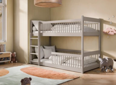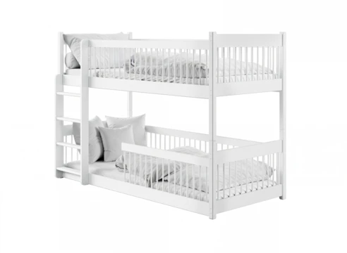 Dětská dvoupatrová postel nabízí dvě pohodlná lůžka nad sebou, ideální pro sourozence do menšího pokoje.