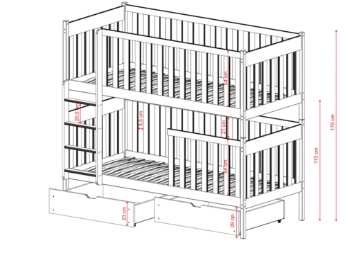 Dvoupatrová postel s úložným prostorem nabízí dvě plnohodnotná lůžka v jednom rámu, ideální pro sourozence nebo hosty.