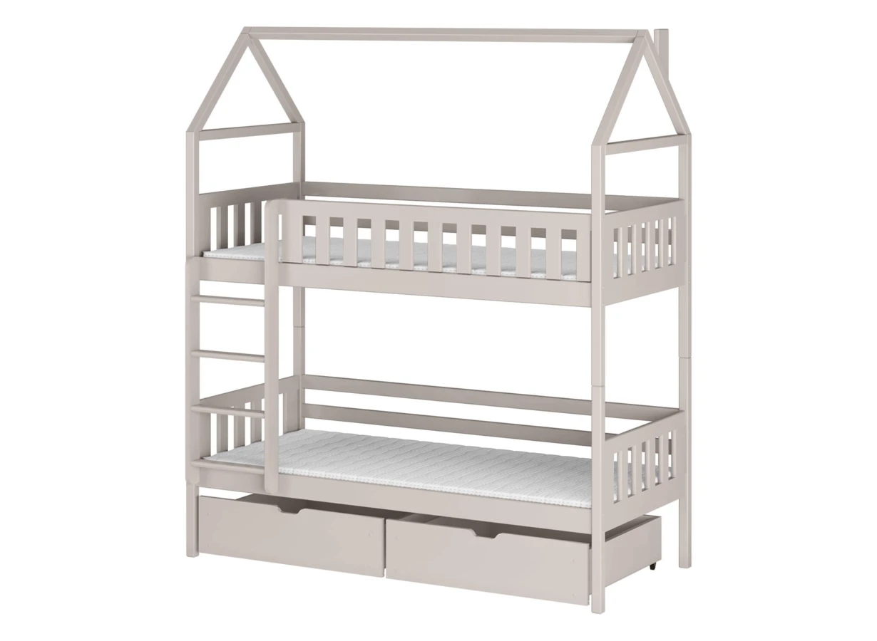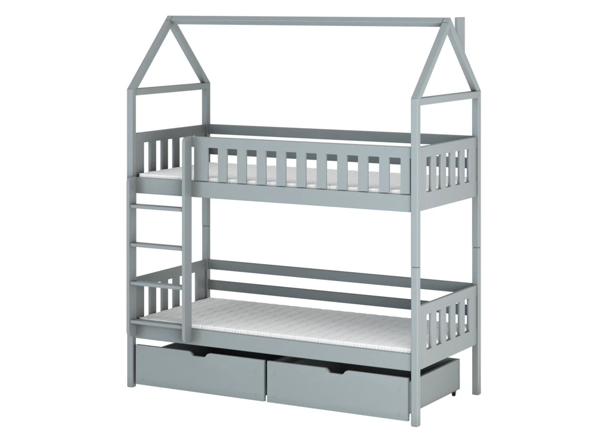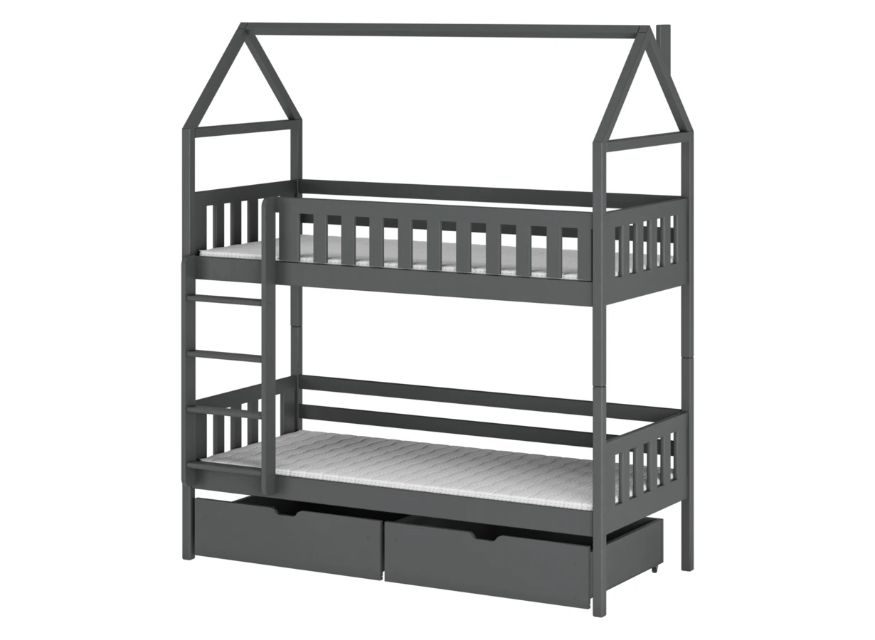 Dvoupatrová postel ve tvaru domečku vytváří v pokoji útulné místo pro sourozence ke spánku i ke hraní.