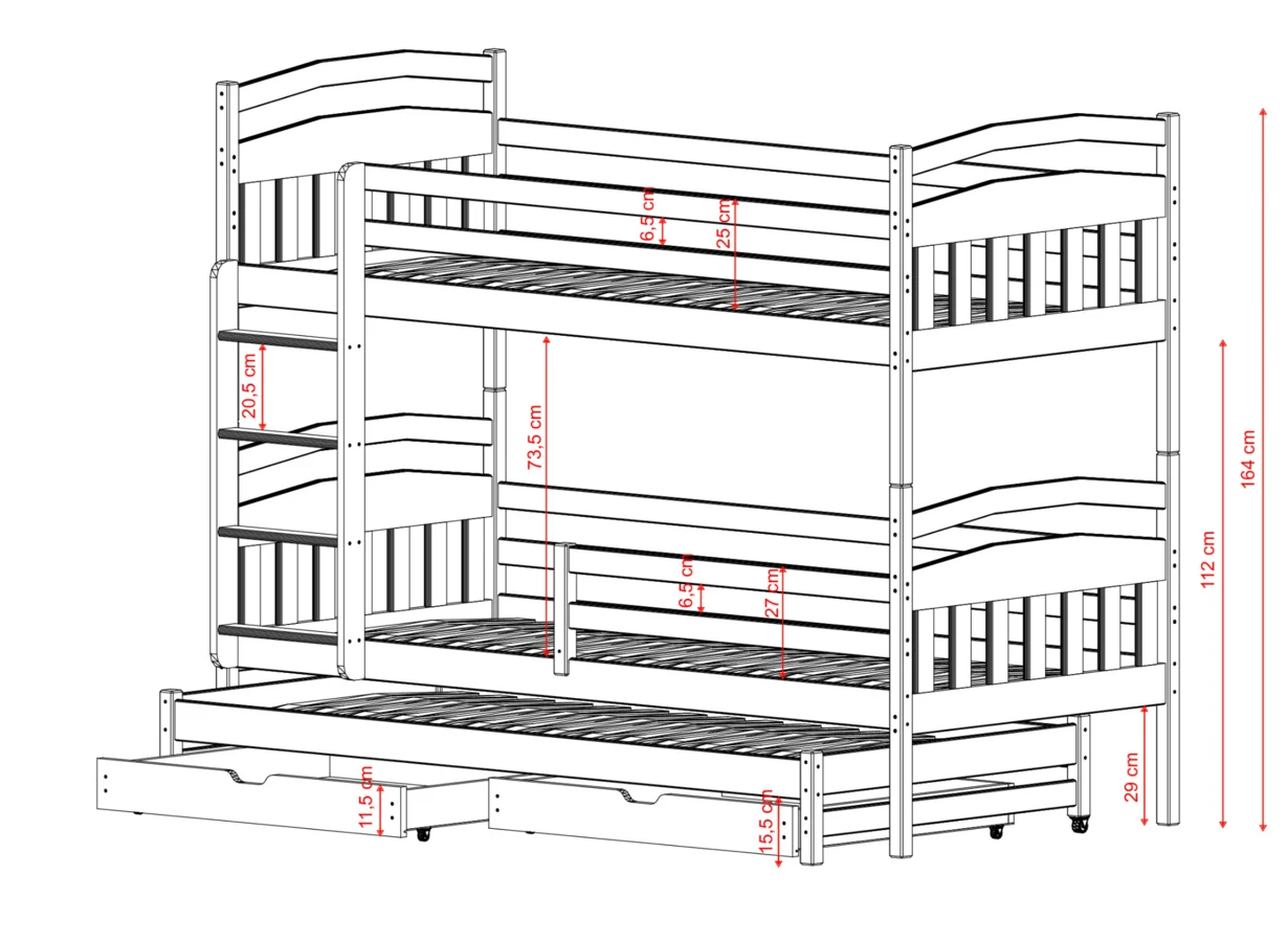 Dětská dvoupatrová postel s přistýlkou nabízí tři lůžka v jednom - perfektní řešení pro sourozence nebo návštěvy.