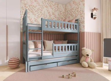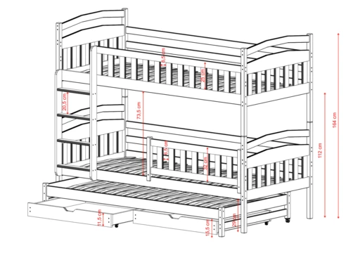 Patrová postel s přistýlkou je navržena pro tři spací místa - horní patro, střední patro a vysouvací přistýlku.
