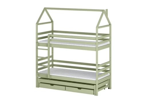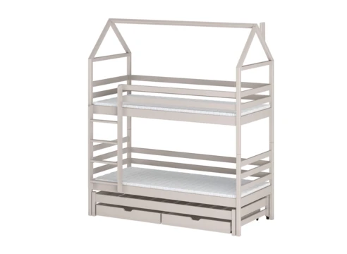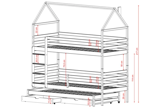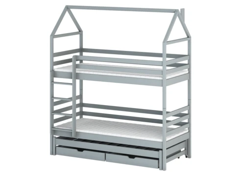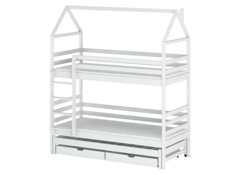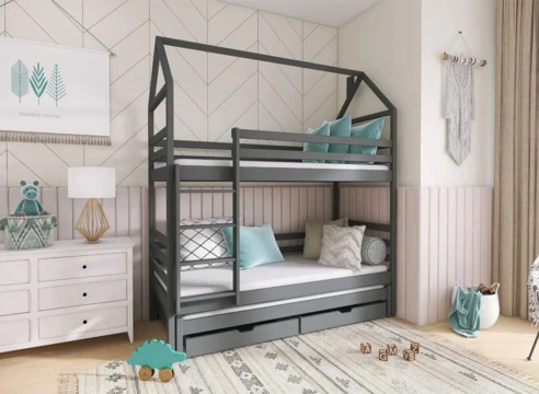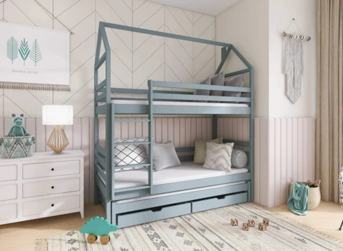 Dvoupatrová postel s přistýlkou ve tvaru domečku přináší kompaktní řešení malého pokoje až pro tři sourozence.