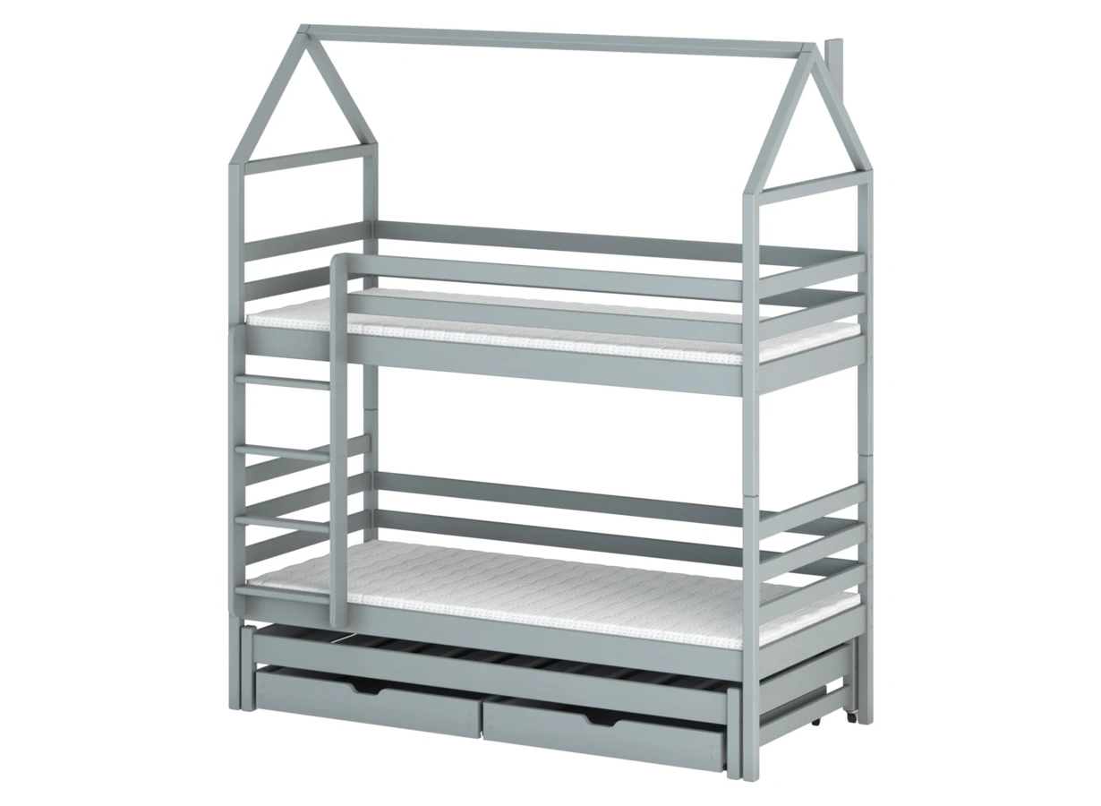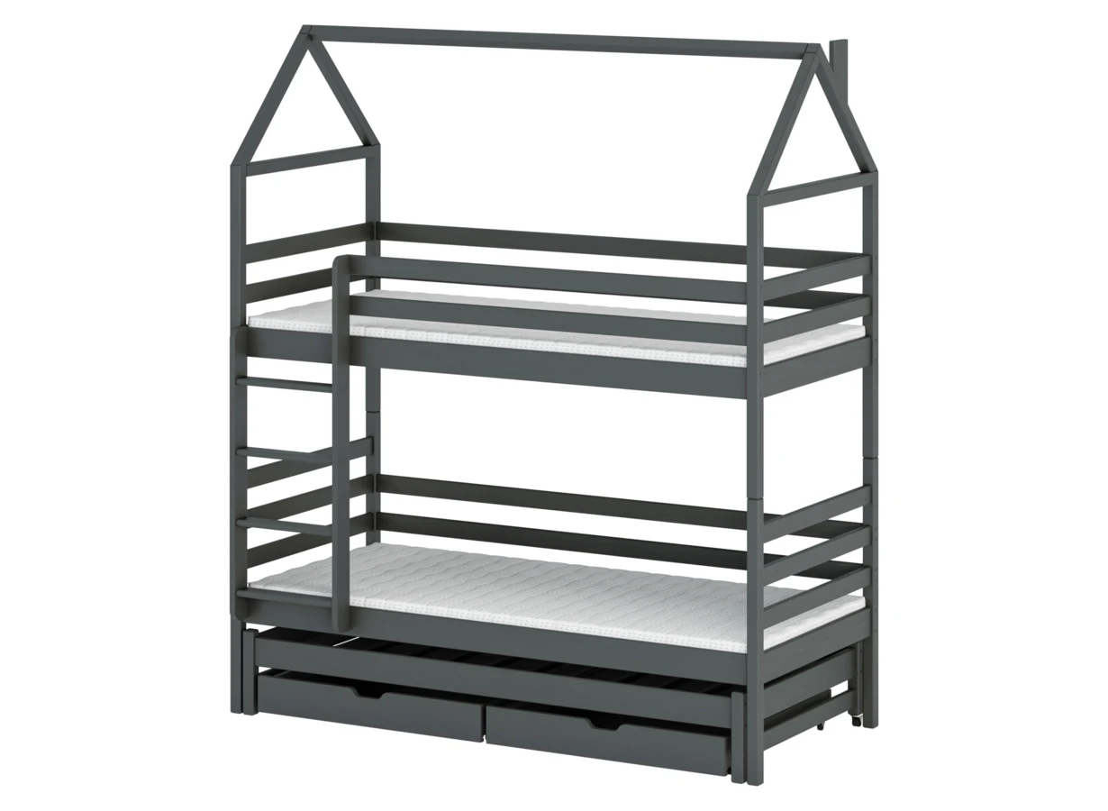Dvoupatrová postel s přistýlkou ve tvaru domečku přináší kompaktní řešení malého pokoje až pro tři sourozence.