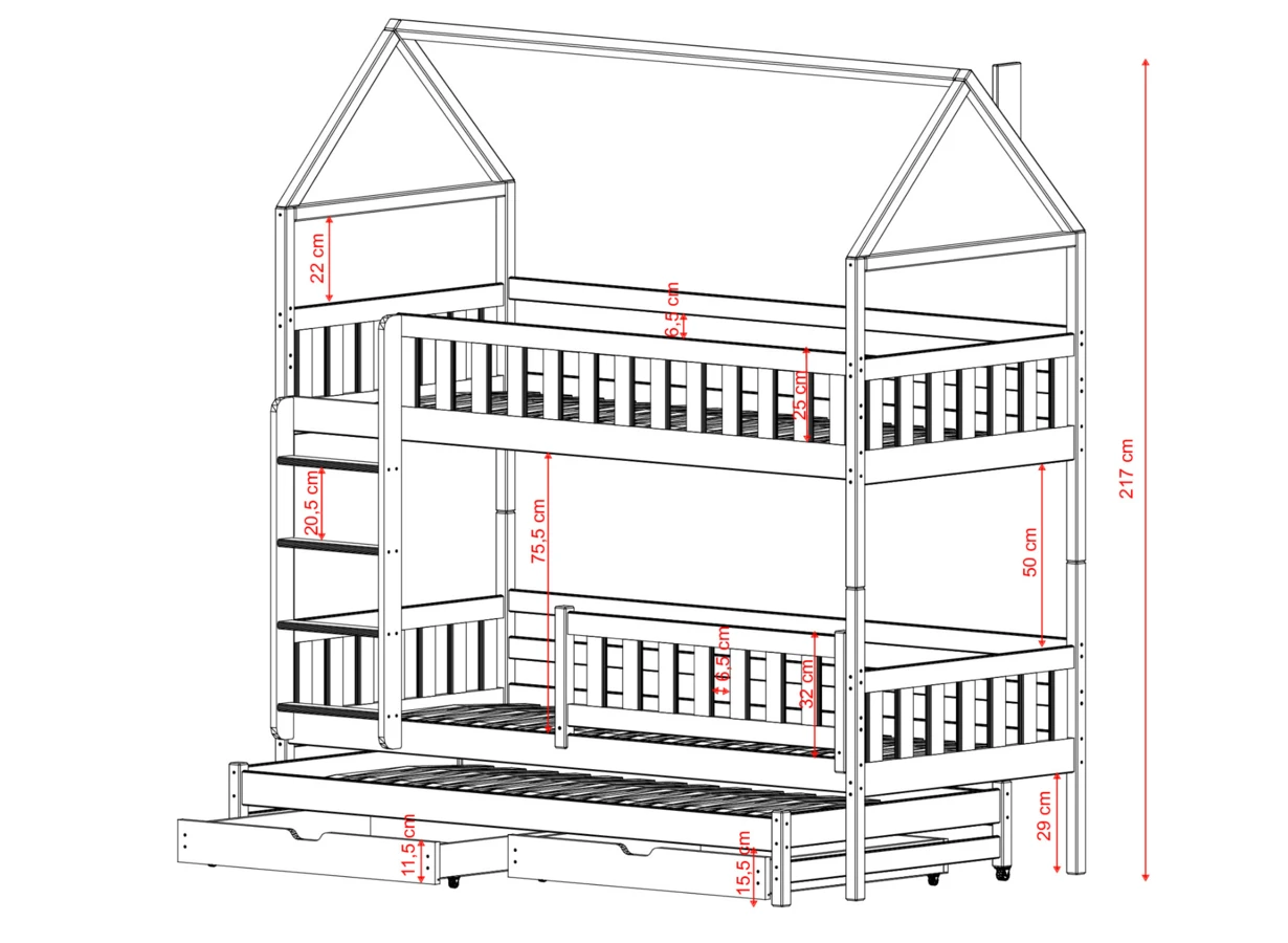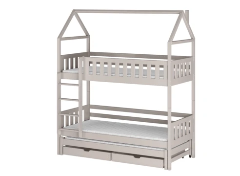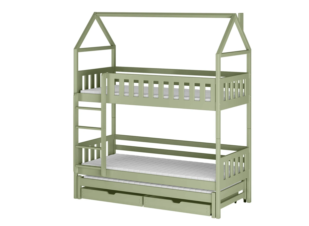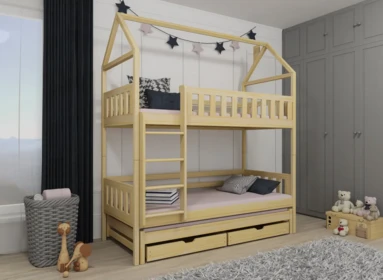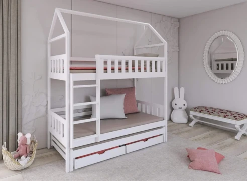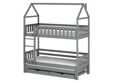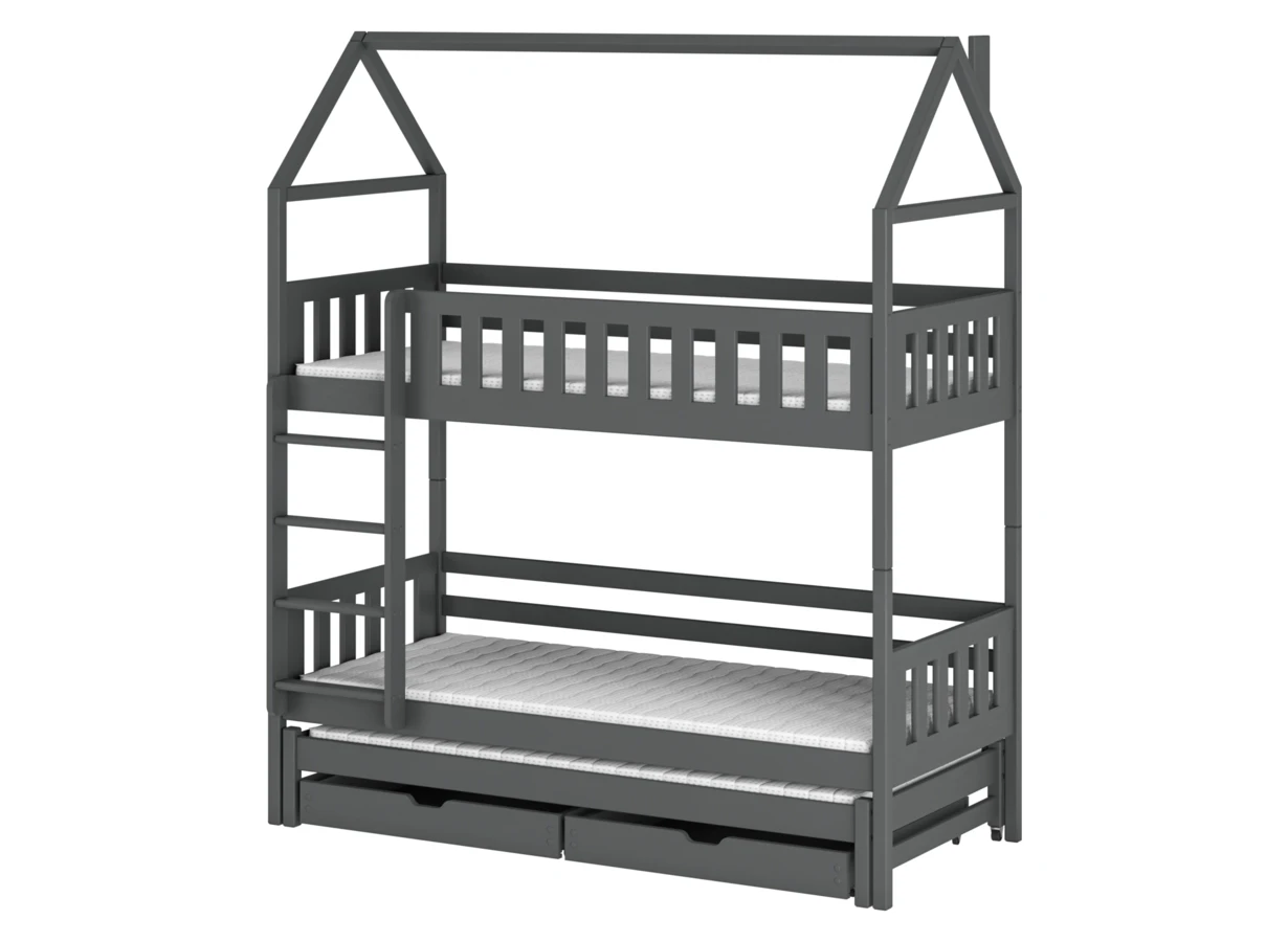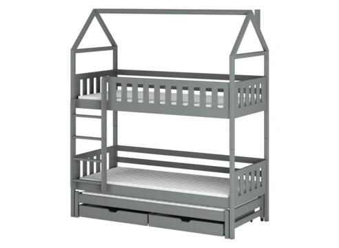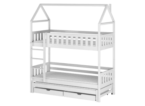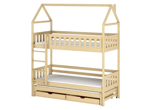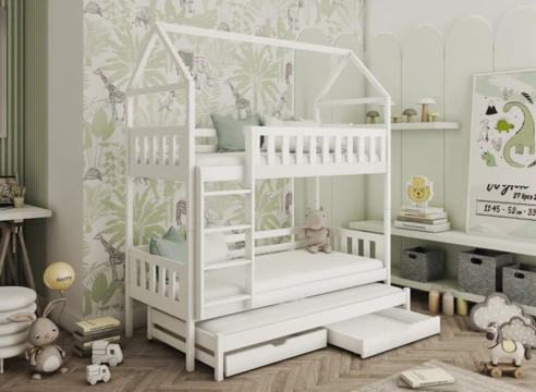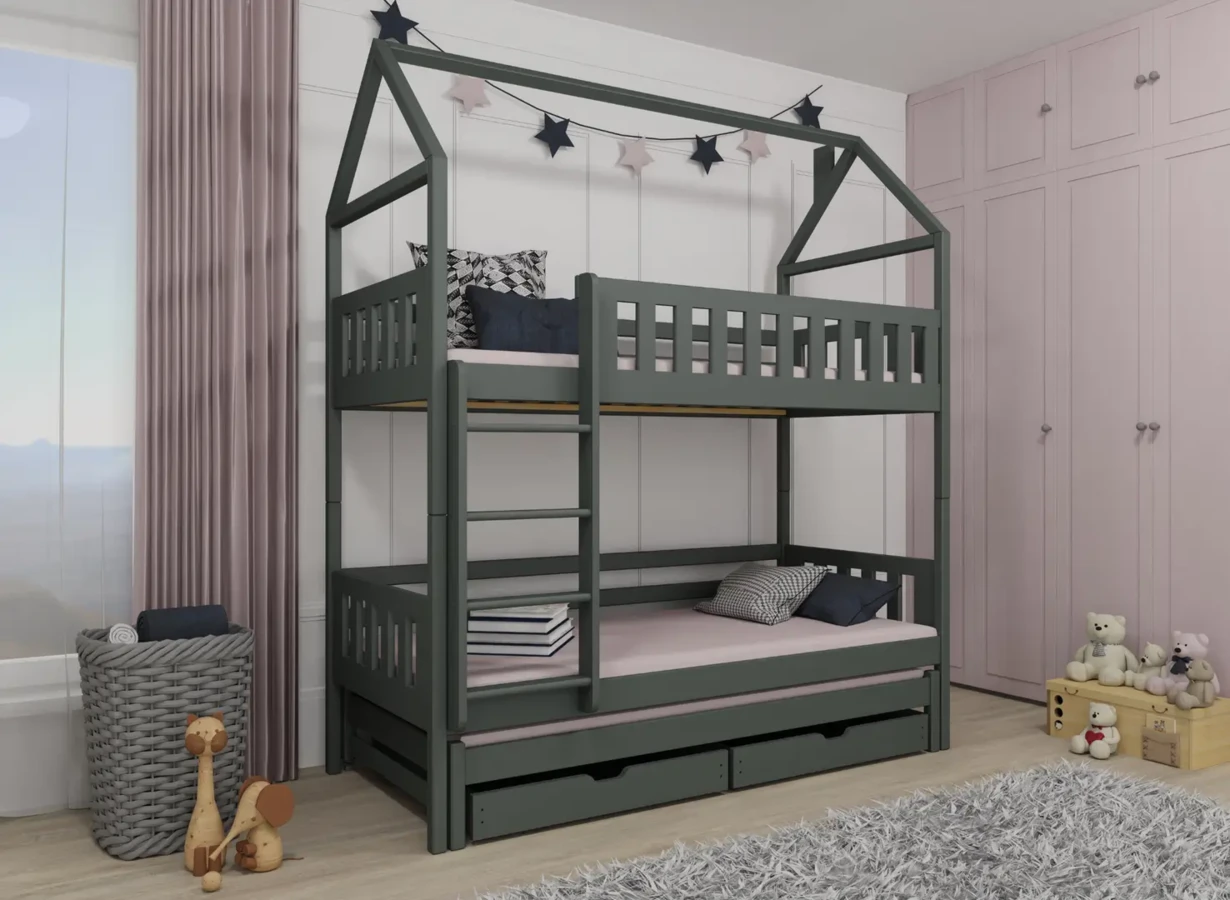 Dvoupatrová postel s přistýlkou ve tvaru domečku nabízí až tři spací místa v jednom, ideální pro sourozence do malého pokoje.