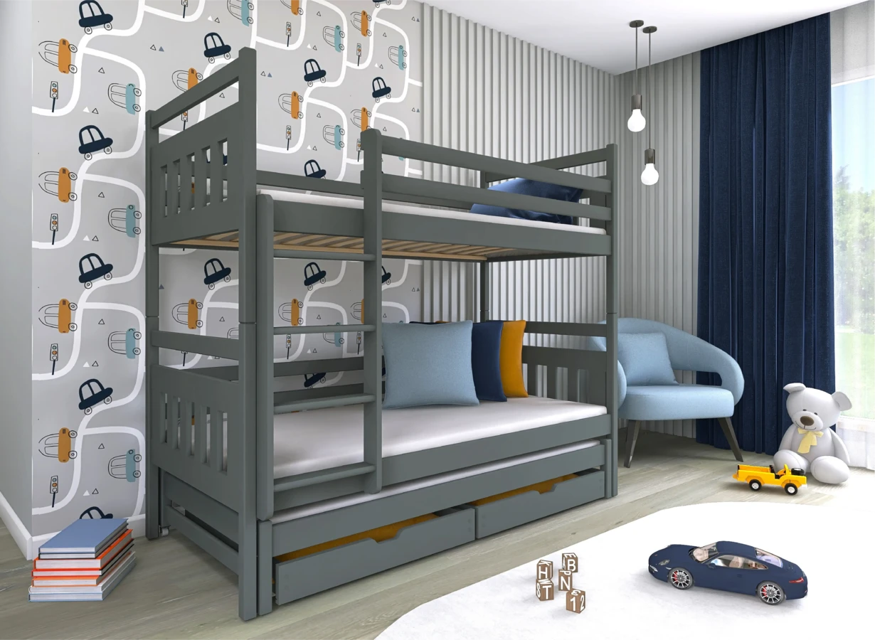 Dvoupatrová postel s přistýlkou nabízí tři lůžka v jednom - ideální pro sourozence do sdílených pokojů i menších prostor.