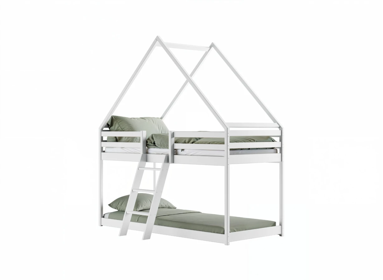 Dětská dvoupatrová postel ve tvaru domečku je ideální pro dvě děti i do menších dětských pokojů