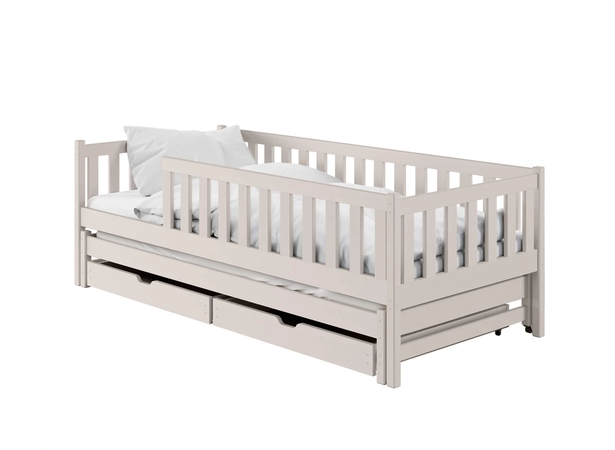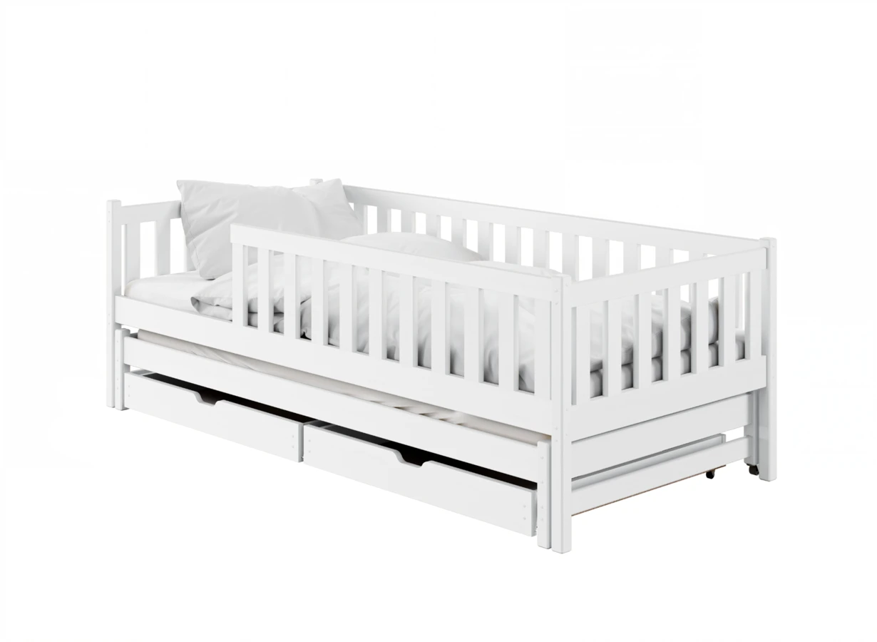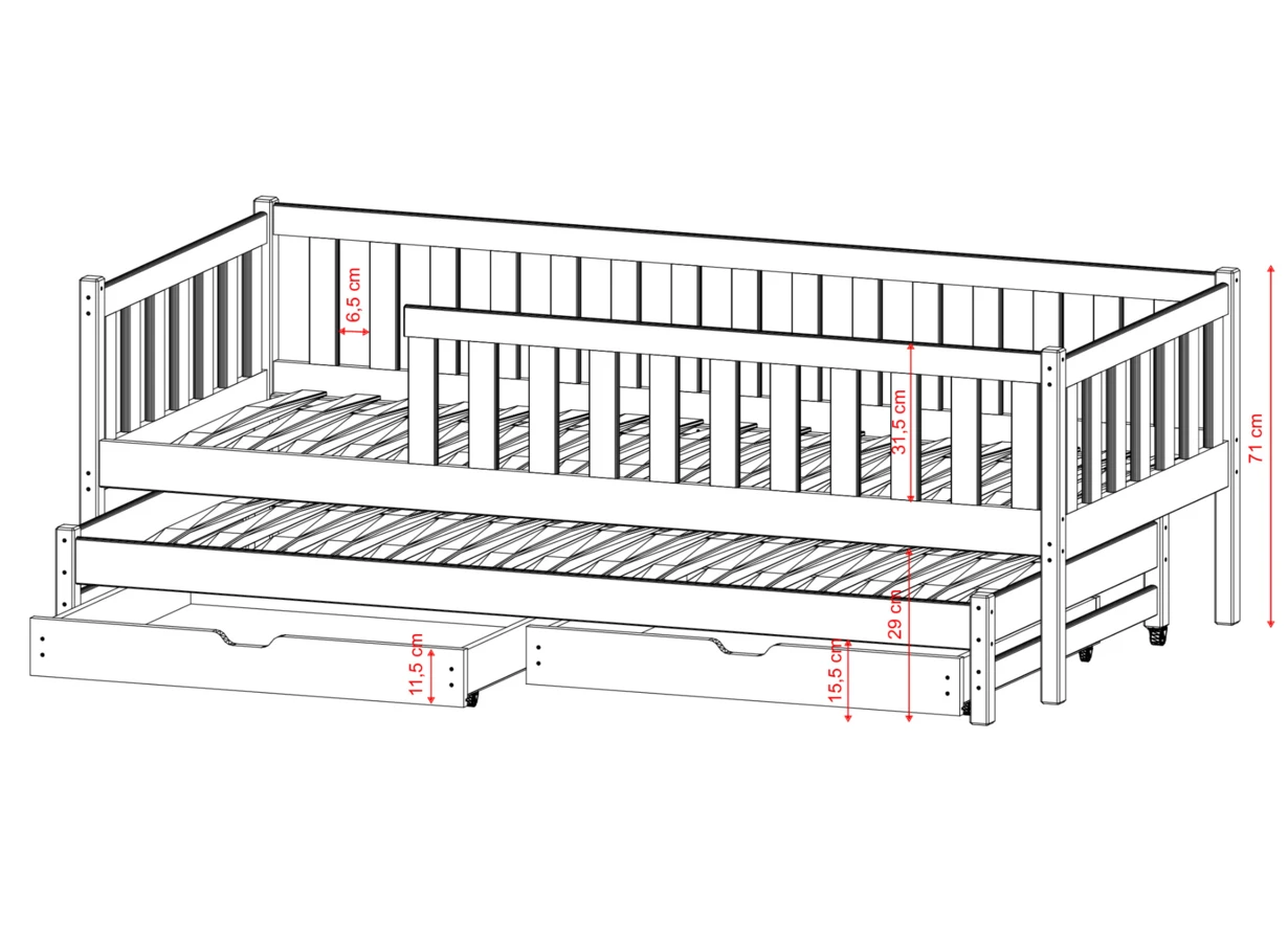 Dětská postel s výsuvnou přistýlkou a úložným prostorem z masivní borovice, ideální pro sourozence nebo pro přespání kamaráda.
