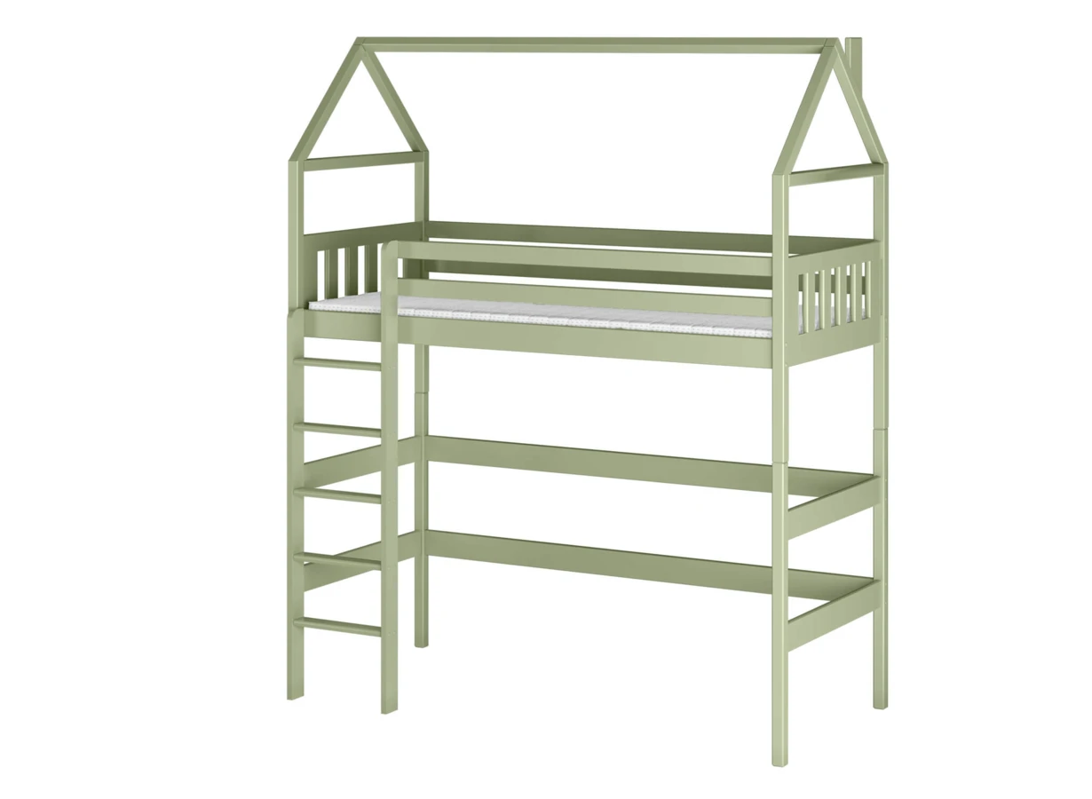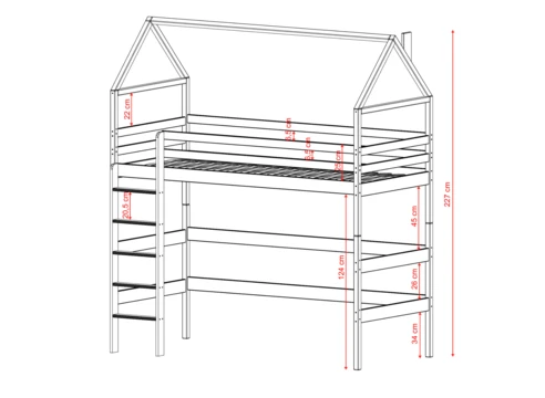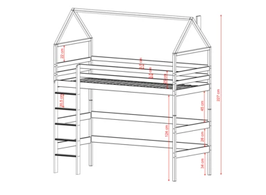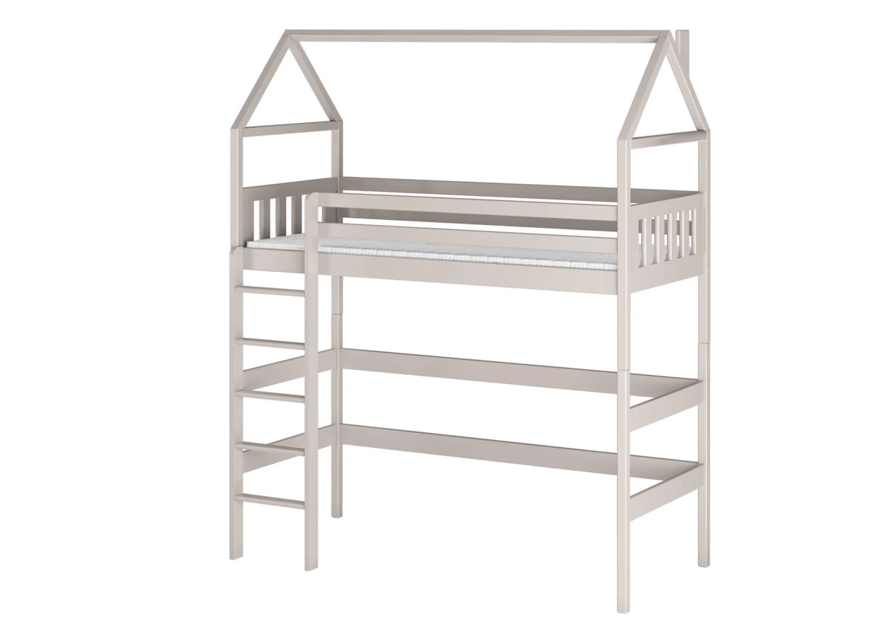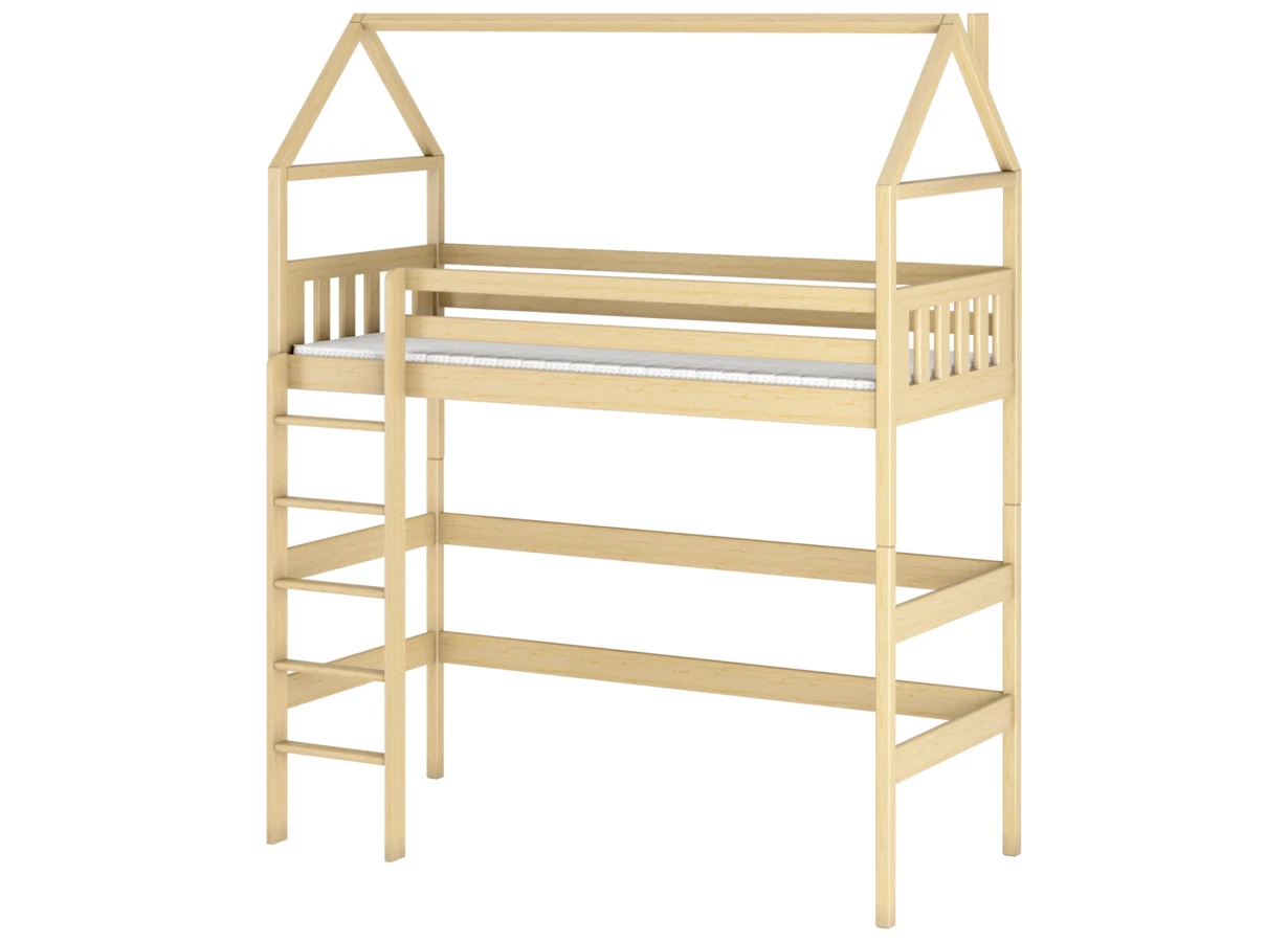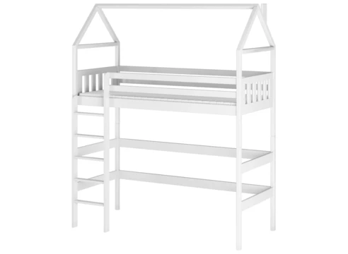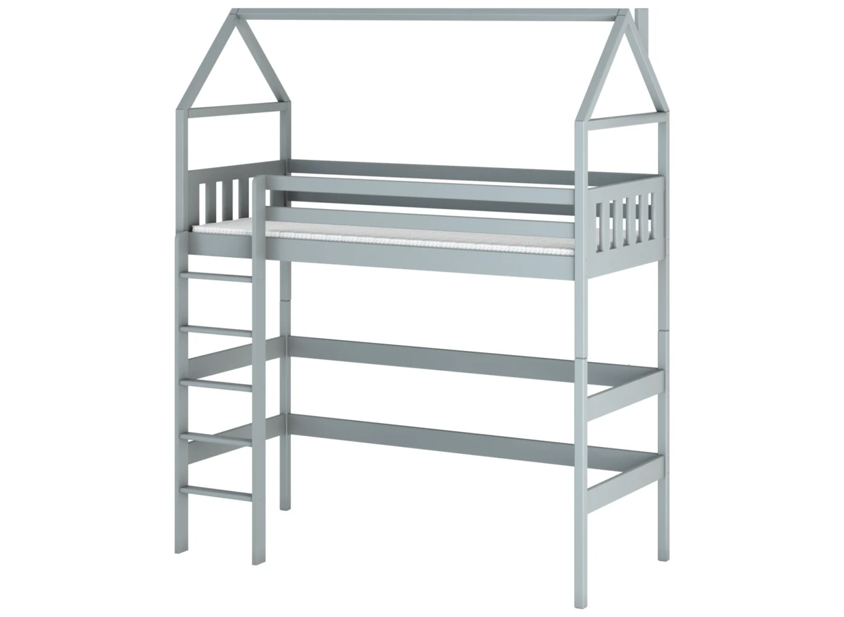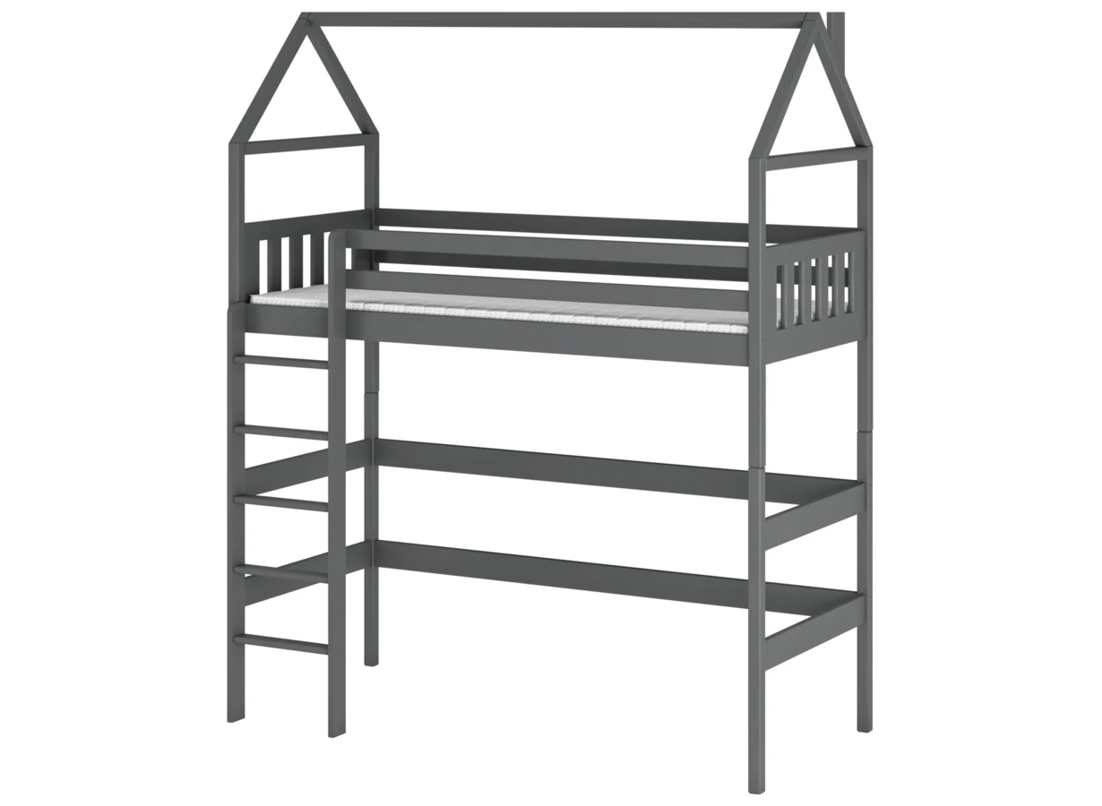 Vyvýšená jednolůžková postel ve tvaru domečku nabízí praktické řešení s lůžkem umístěným nad podlahou.
