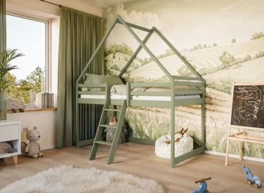 Vyvýšená jednolůžková postel ve tvaru domečku kombinuje hravý design a praktické řešení místa v pokojíčku.
