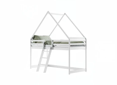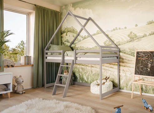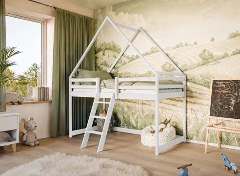 Vyvýšená jednolůžková postel ve tvaru domečku kombinuje hravý design a praktické řešení místa v pokojíčku.