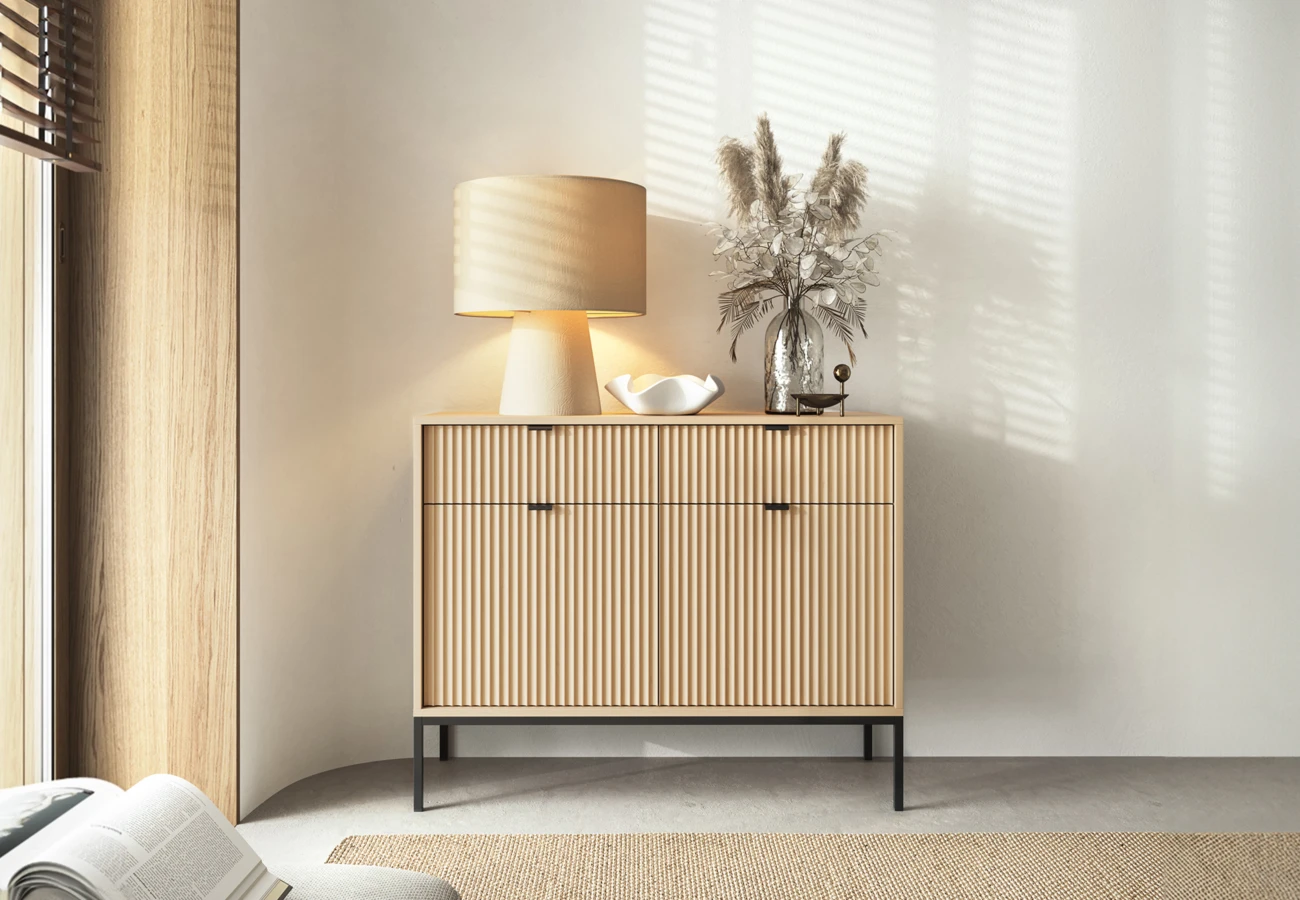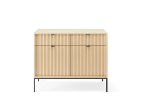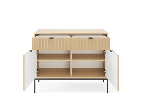 Disponuje dvěma dvířky, dvěma policemi a dvěma zásuvkami.