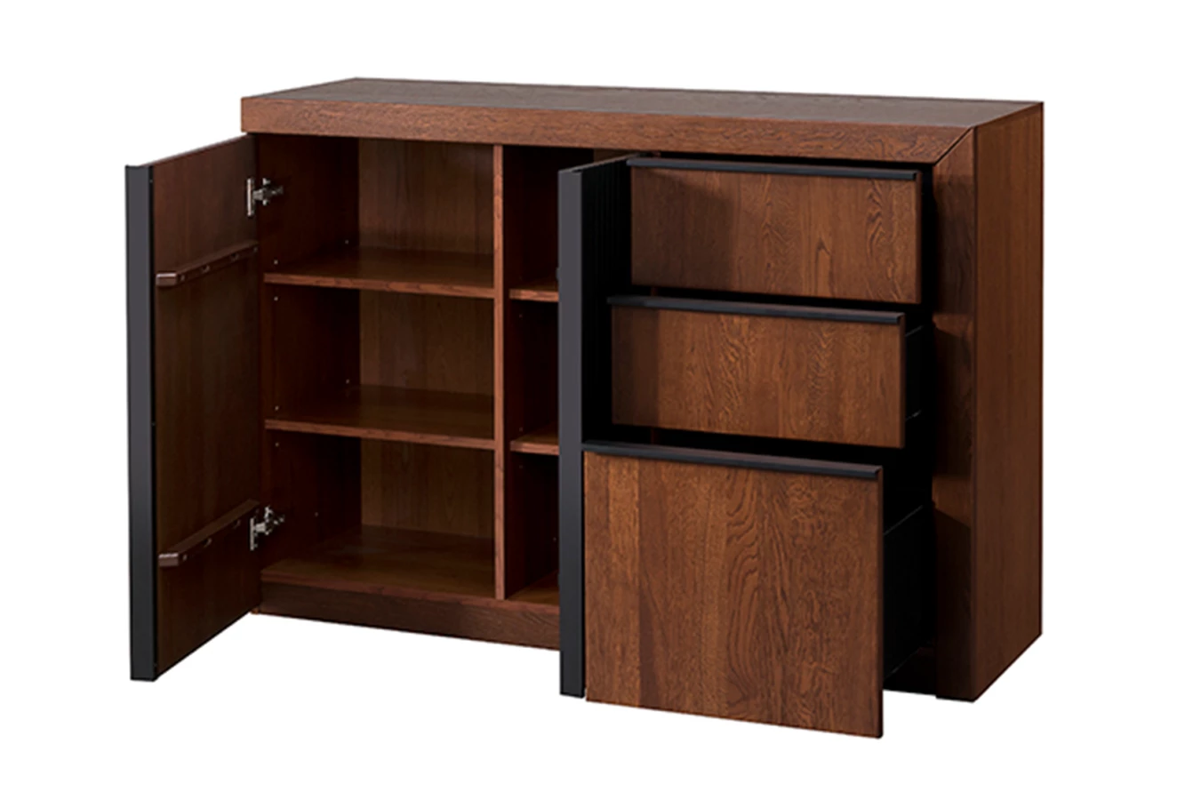s nábytkovou deskou v dekoru imitujícím dřevo zevnitř.