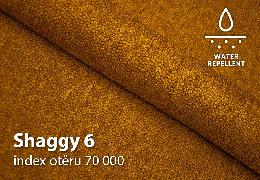 Potah tvoří příjemná látka Shaggy 6 s voděodolnou impregnací a dřevěné nožky jsou v dekoru Tmavý ořech - BIS 13.