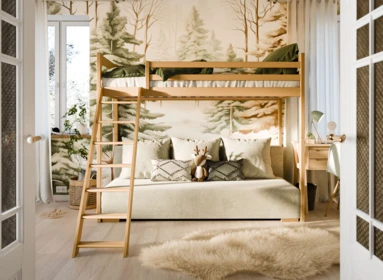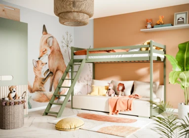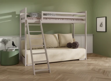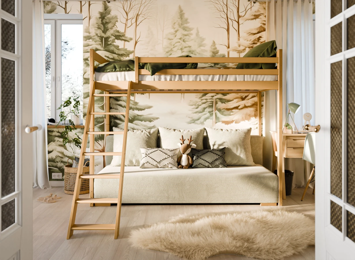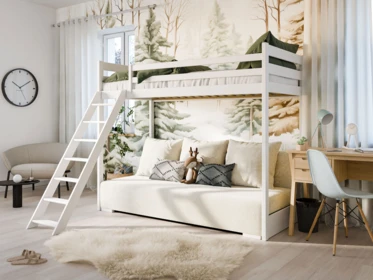 Dětská patrová postel s rozkládací pohovkou kombinuje horní lůžko a spodní rozkládací pohovku.