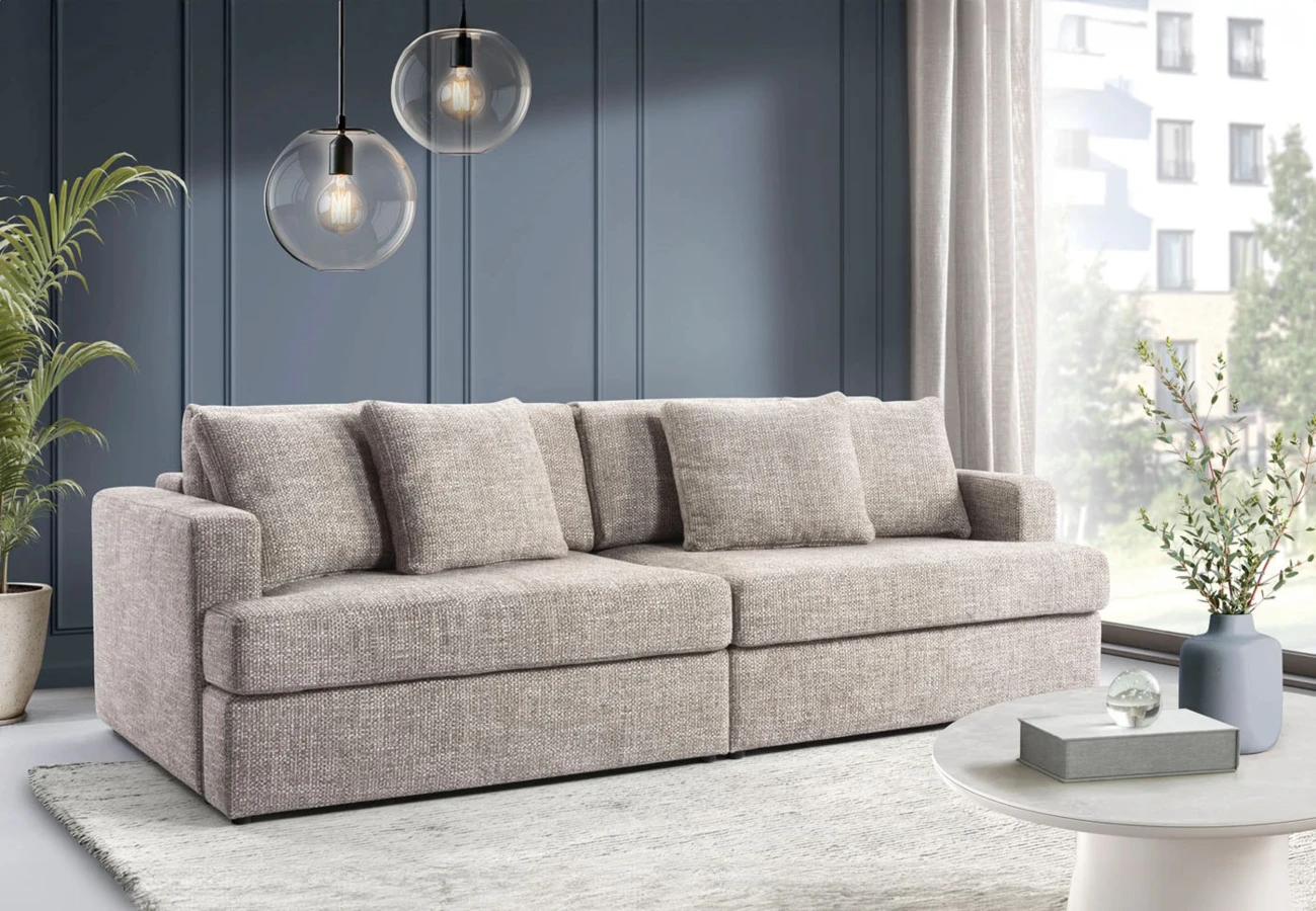 Rozkládací pohovka s úložným prostorem nabízí pohodlné sezení, měkké polštáře a nadčasový design.