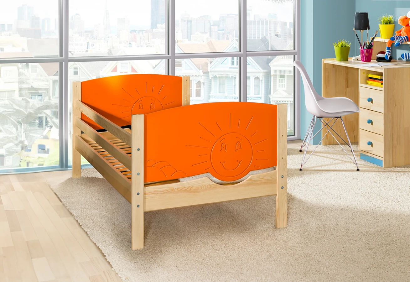 Čela postele jsou v růžovém provedení s motivem sluníčka na obou.