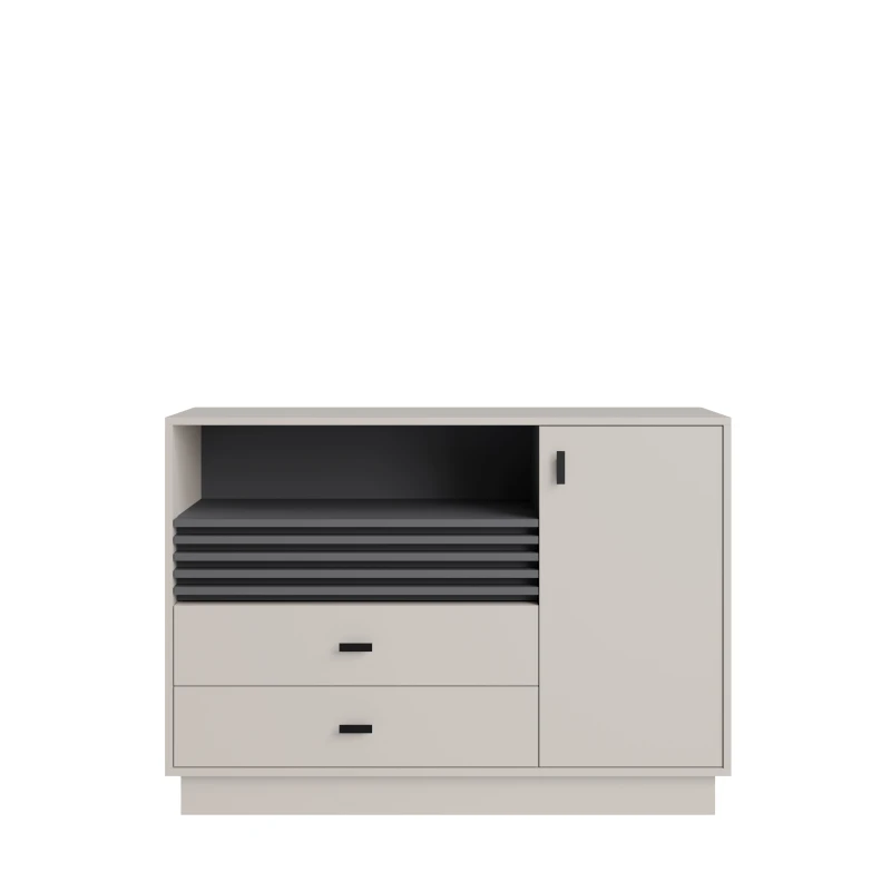 Vneste do svého interiéru kouzlo domova s kolekcí nábytku Allmo. Útulné provedení v dekoru kašmír zdobí kontrastní lamely v barvě antracitu. Zdobení lamely je v poslední době velmi oblíbené a proto bude váš interiér vypadat nejen útulně, ale zároveň půjde ruku v ruce s nejnovějšími trendy. Celá kolekce je doplněna minimalistickými černými úchyty, které krásně doplňují její celkový vzhled.