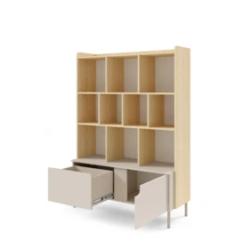 Je vybavena deseti přihrádkami, jednou skříňkou s dvířky a jednou zásuvkou.