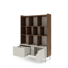 Je vybavena deseti přihrádkami, jednou skříňkou s dvířky a jednou zásuvkou.