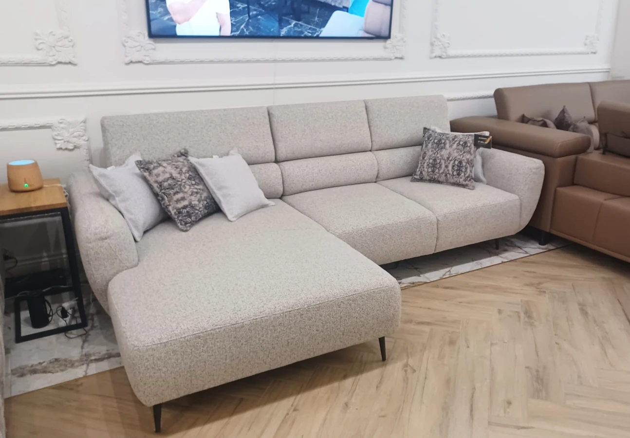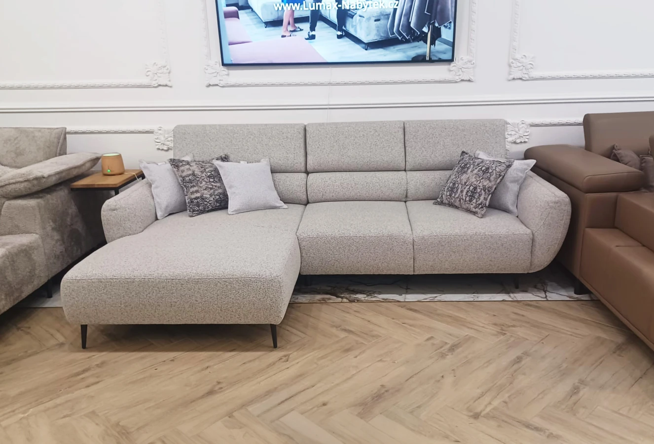 Potah tvoří šedá tkanina Puente 9 s indexem otěru 100 000 cyklů. Rohová varianta sedačky je levý roh.