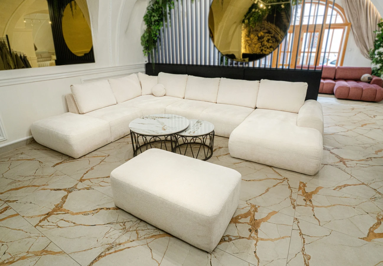 Rohová sedací souprava do U v moderním minimalistickém stylu.