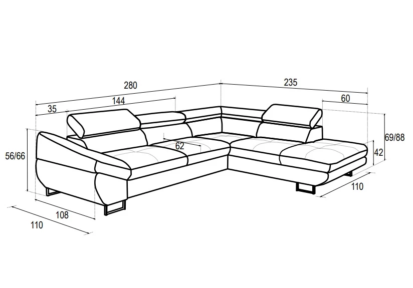 69/88 cm (sklopené/zvednuté záhlavníky)