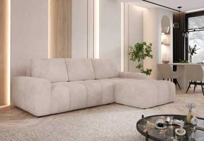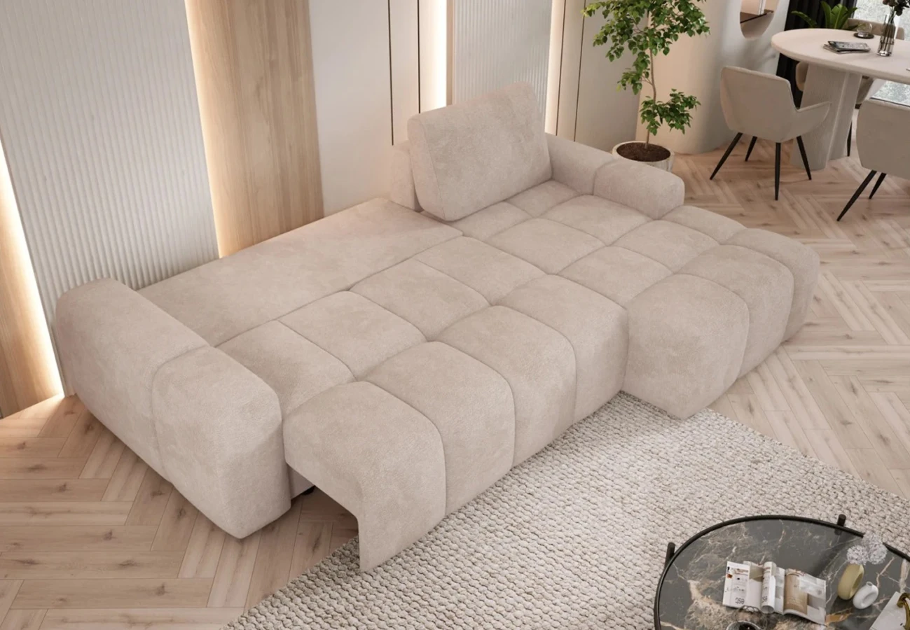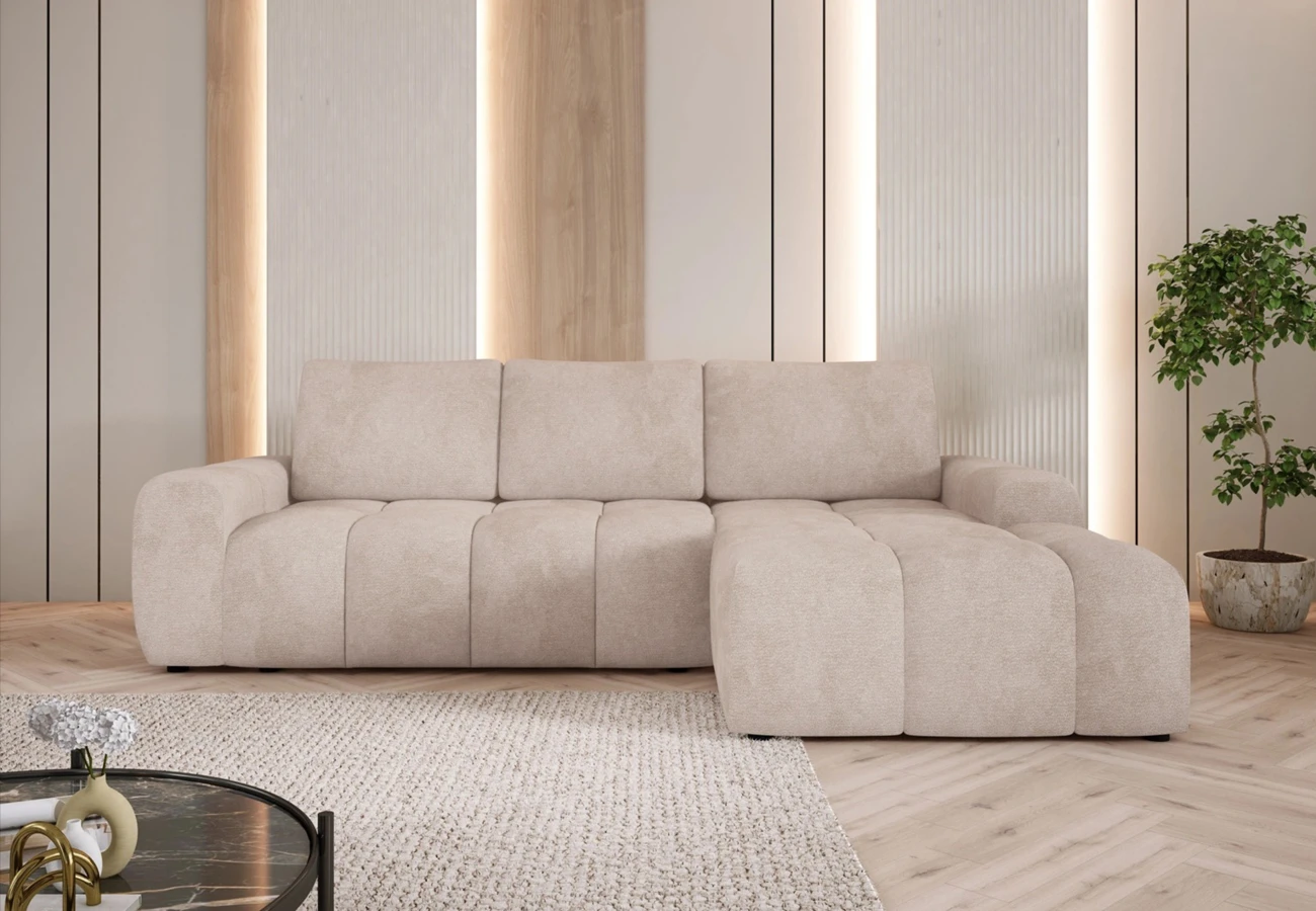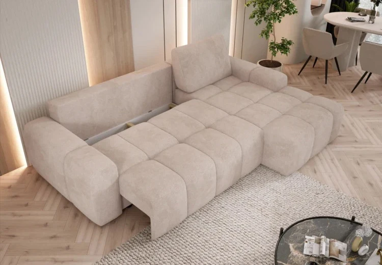 Moderní rozkládací sedačka do L s úložným prostorem.