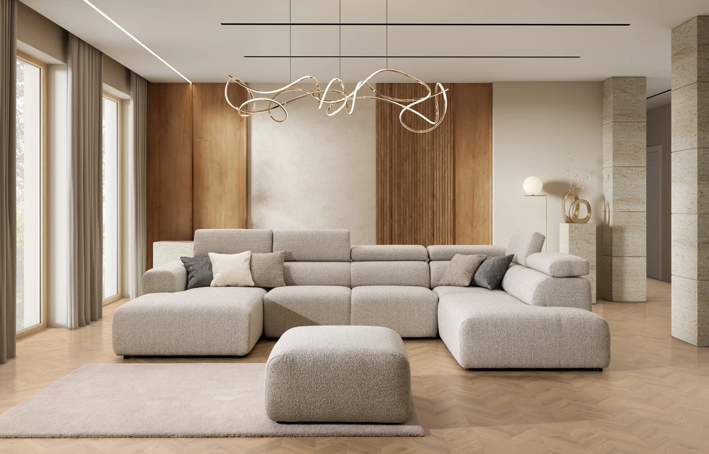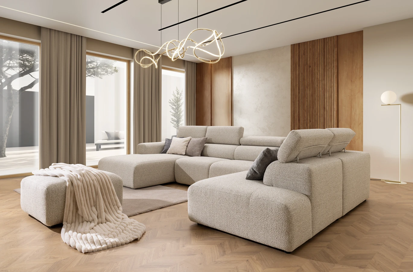 Rohová sedací souprava do U v moderním minimalistickém stylu.
