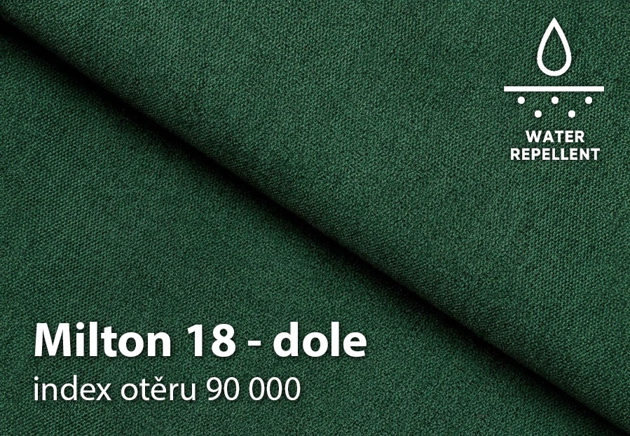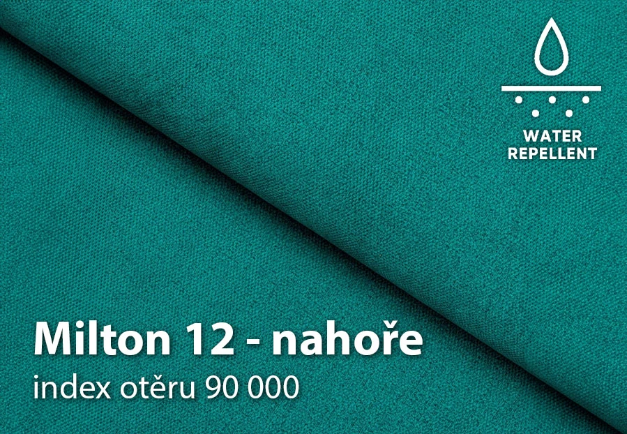 Potah tvoří látka Milton 12 v tyrkysové barvě a korpus látka Milton 18 v zelené barvě, obě s voděodolnou impregnací.