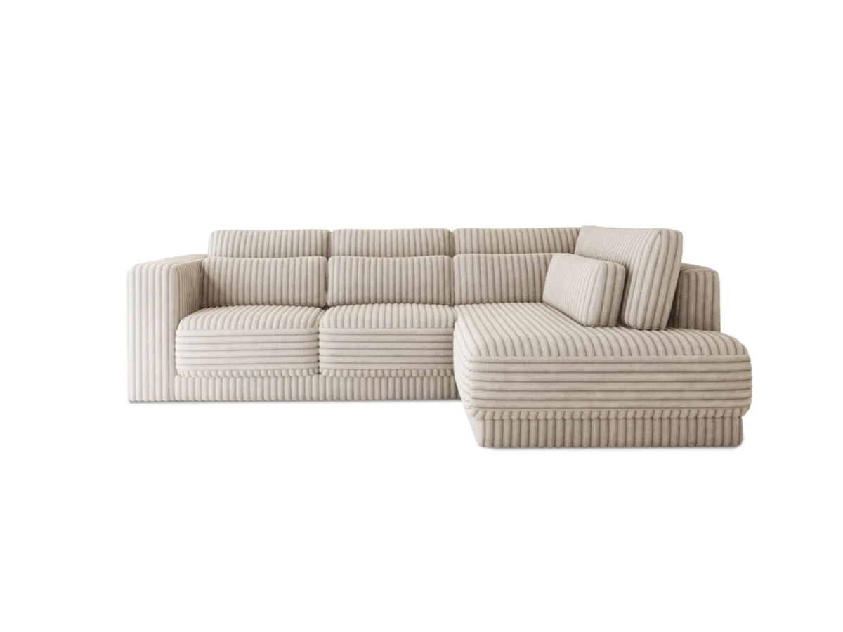Minimalistická rohová sedačka do L s polštářky a hladkými sedáky.