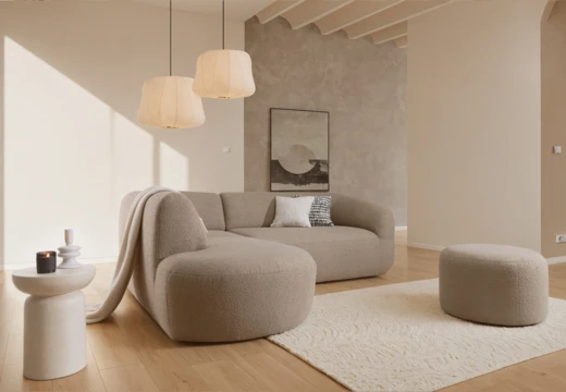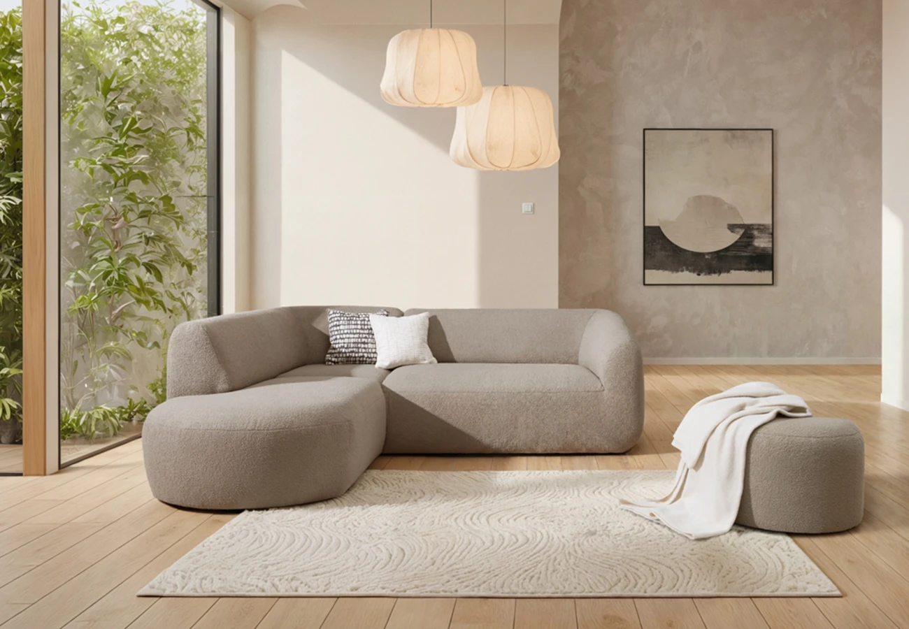 Minimalistická sedací souprava do L, která usadí celou rodinu.