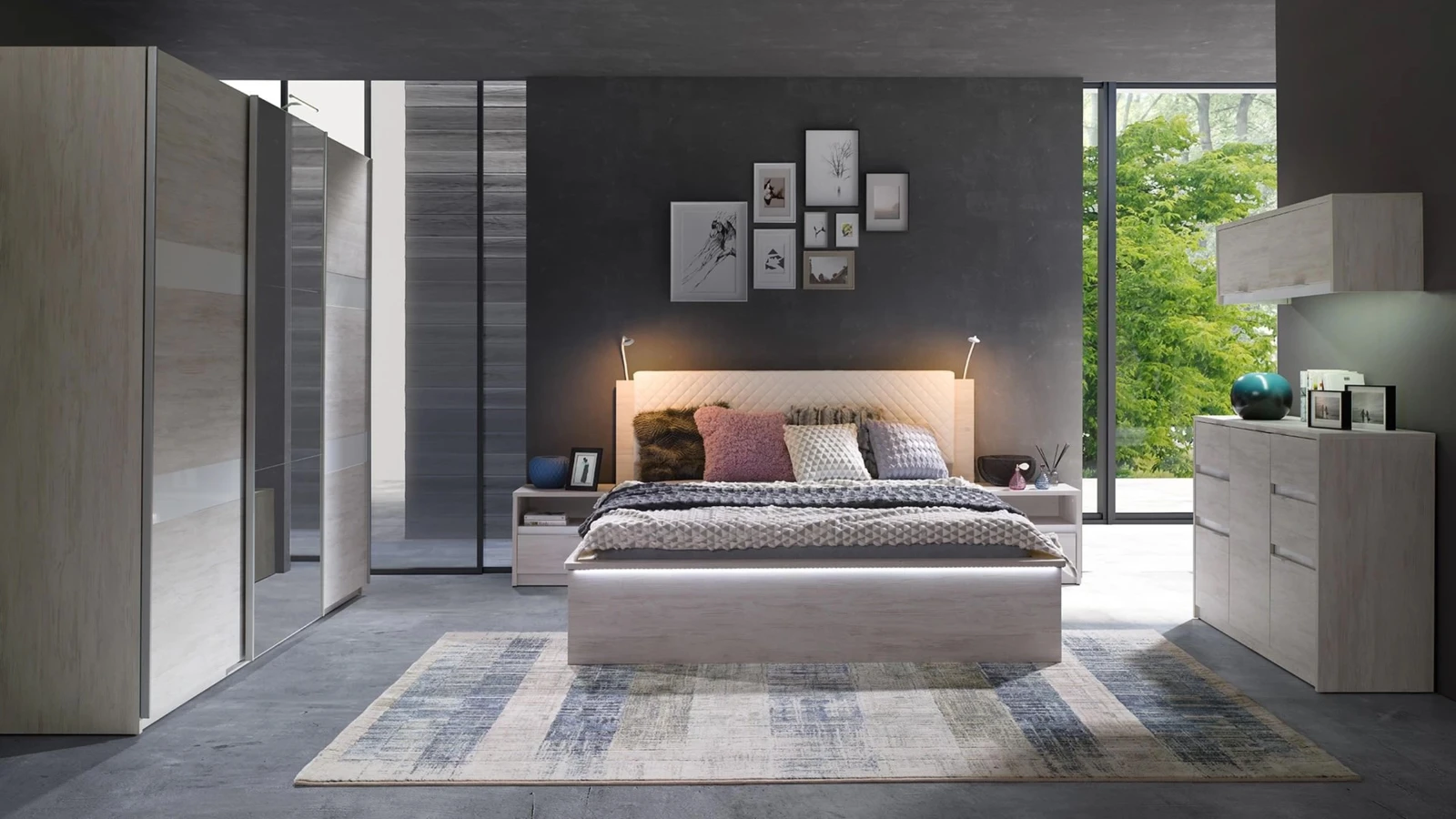 Elegantní dekor bíle tónovaného dubu doplňují