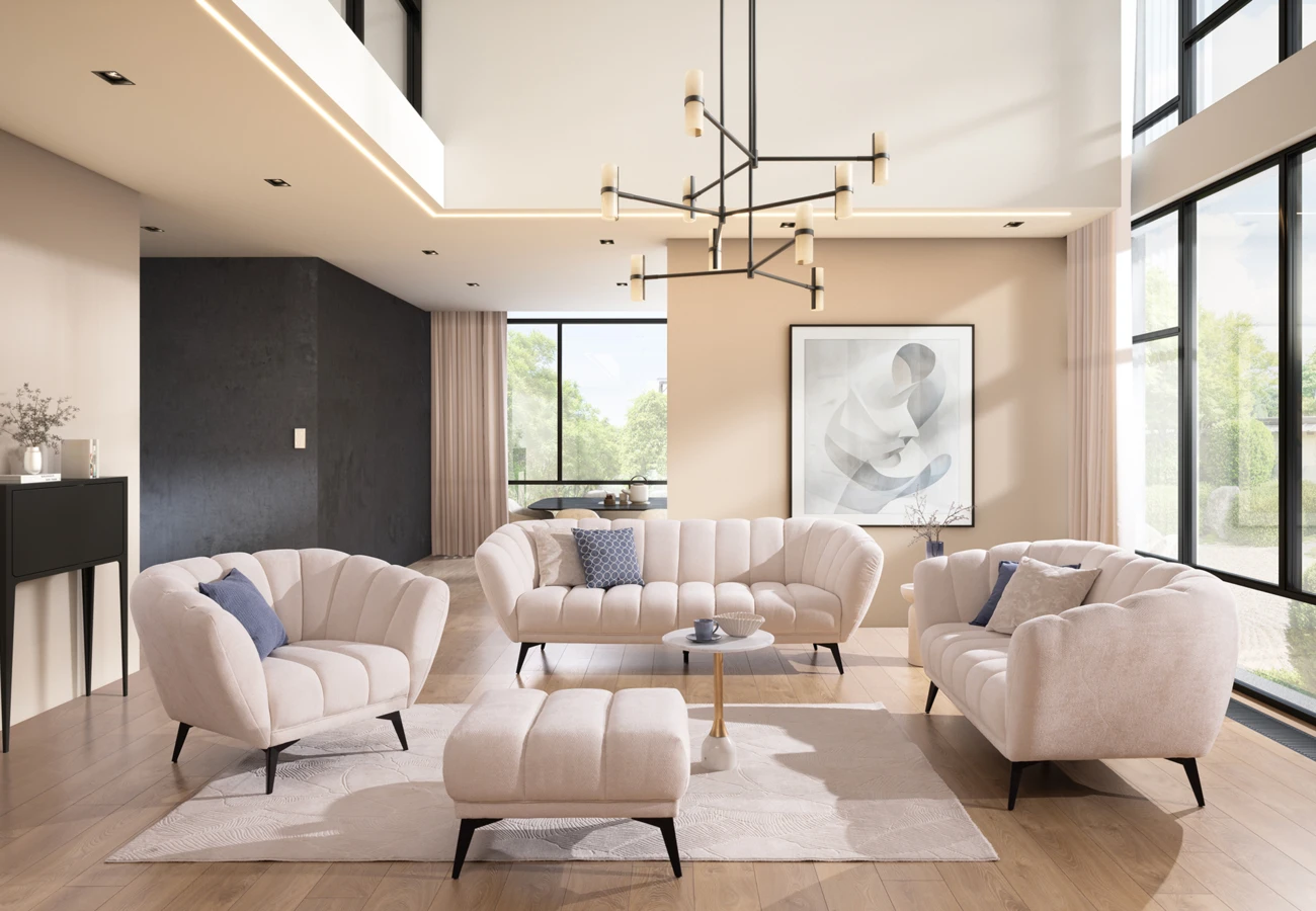 Sedací souprava Valetti 3+2+1 s taburetem je designový kousek, který okamžitě upoutá pozornost a dodá interiéru jedinečný charakter. Její elegantně zaoblené linie, jemné prošívání a lehká konstrukce na vysokých nožkách vytváří vzdušný a moderní dojem. Nejde ale jen o vzhled. Valetti nabízí i příjemné pohodlí, které oceníte při každodenním odpočinku. Pokud hledáte sedací soupravu, která spojuje styl, originalitu a komfort, Valetti je přesně ta pravá.