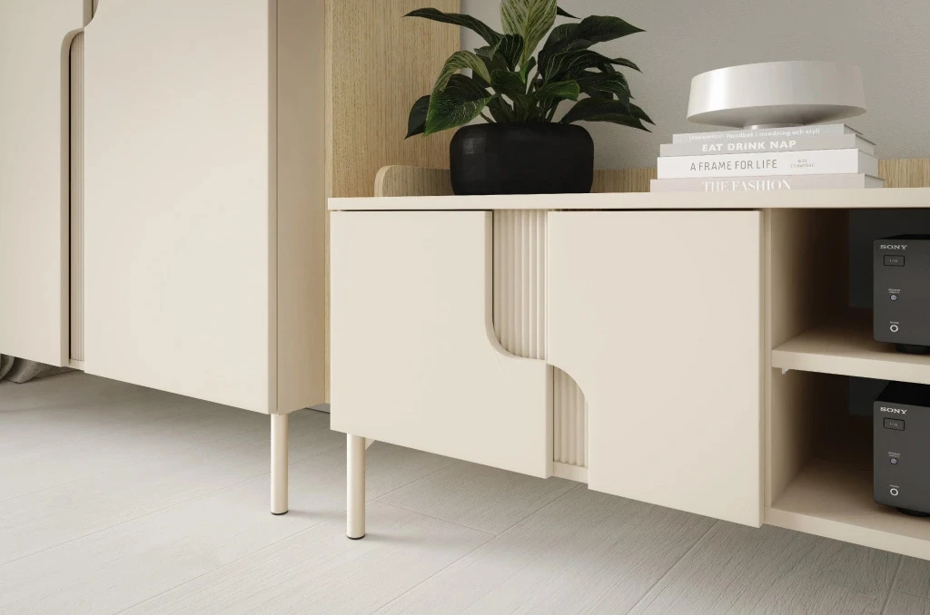 Dvířka jsou zdobeny originálními průřezy, které odhalují rafinované vertikální frézování.
