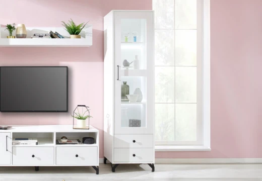 Moderní vitrína Bergen BE3 se hodí do každého interiéru, kterému dodá jedinečnou atmosféru. Je součástí nové stejnojmenné kolekce Bergen. Kostra je vyrobena z kvalitní laminátové a MDF desky.